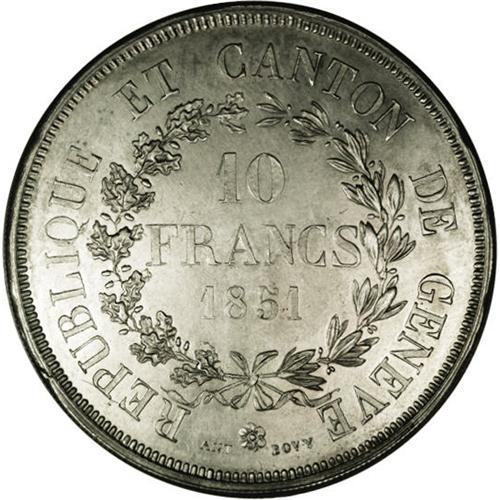 Geneva. 10 Francs 1851, KM138, D-374, Uncirculated with Geneva. 10 Francs 1851,
