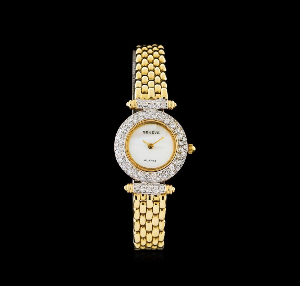 One ladies, cast & assembled Geneve wristwatch electronically tested 14KT yellow gold, Case: 22mm diameter, Case Back: space available for engraving, Fixed Case Lugs: set with diamonds, Crown: scalloped, Bezel: diamond set. Swiss Movement: six jewel quartz, Geneve signed Dial: mother of pearl with baton pointed hands, Bracelet: 14KT yellow gold links, Condition: G-6 Extra Fine. Six and one half inch length. Over-locking clasp, with pattern continuation. Containing: Fifty-Six prong set round brilliant cut diamonds, measuring 1.60 - 1.60 x 0.96mm (depth est.) approximate total weight of 56 Stones = 0.88ct. Graded in the setting. Clarity: SI-1 to I-1. Color: G - H Twenty prong set round brilliant cut diamonds, measuring 1.40 - 1.40 x 0.84mm (depth est.) approximate total weight of 20 Stones = 0.22ct. Graded in the setting. Clarity: SI-1 to I-1. Color: G - H. Total Weight of Diamonds 1.10ct. Total Weight of Watch 34.39gm. AIG Appraised.