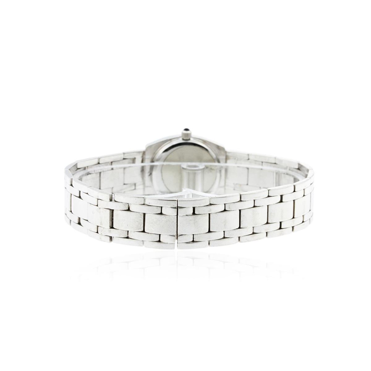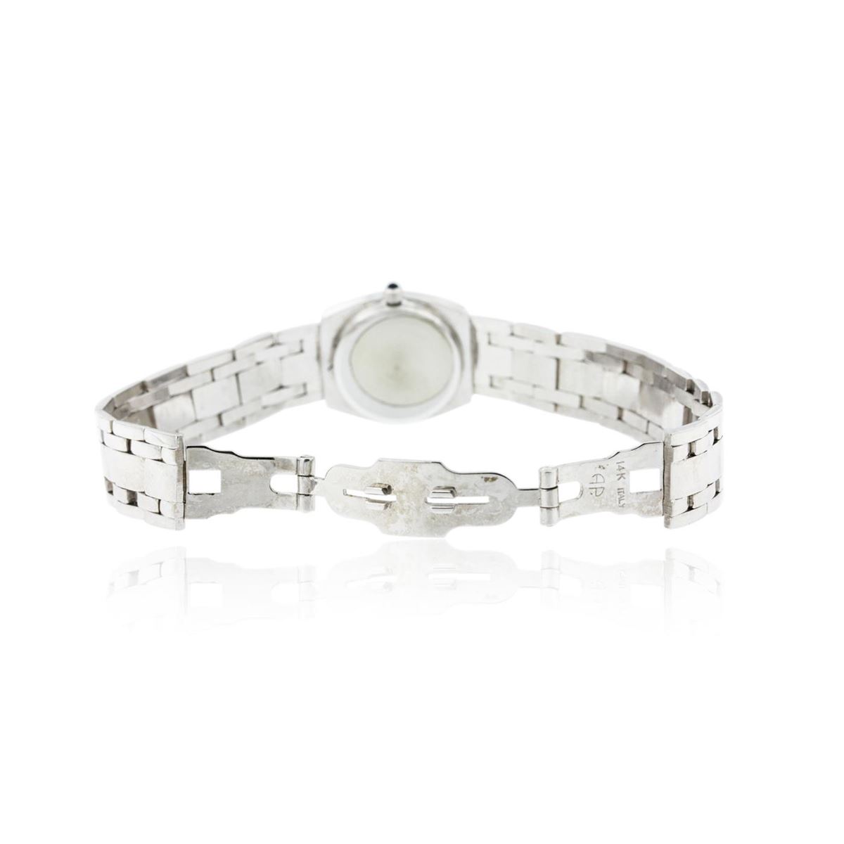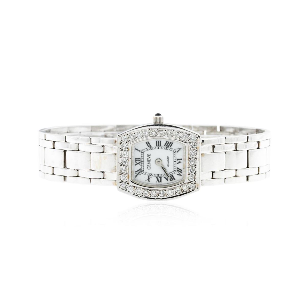 One ladies, cast & assembled Genève wristwatch electronically tested 14KT white gold, Case: 23 x 21mm, Crown: scalloped, set with a Blue cabochon crystal, Bezel: diamond set. Movement: quartz, Dial: White, baton pointed hands and Roman numerals, Bracelet: 14KT white gold links, Condition: G-4 Average. Six and one half inch length. Concealed deployment clasp. Containing: Thirty bead set round brilliant cut diamonds, measuring 2.00 - 1.90mm in diameter, approximate. Total Weight of 30 Stones = 0.92ct. Graded in the setting. Clarity: SI-2 to I-2. Color: G - H. Total Weight of Diamonds 0.92ct. Total Weight of Watch 52.71 grams. AIG Appraised at $6,050.00.
