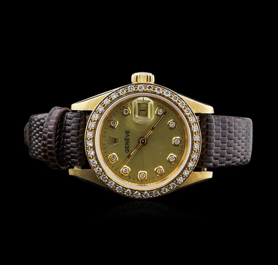 One Geneve 18KT Yellow Gold Ladies Rolex Replica Watch. Case: 18KT yellow gold. Crown: 18KT yellow gold quickset with Rolex logo. Bezel: 18KT Yellow gold set with diamonds. Dial: Gold tone color with diamond markers. GENEVE logo located at the top portion of the dial accompanied by the Rolex logo at the 12 o'clock position. Date window located at the 3 o'clock position. Bracelet and clasp: Genuine leather with standard buckle clasp. Please note that this watch contains Rolex parts but is not an authentic Rolex.