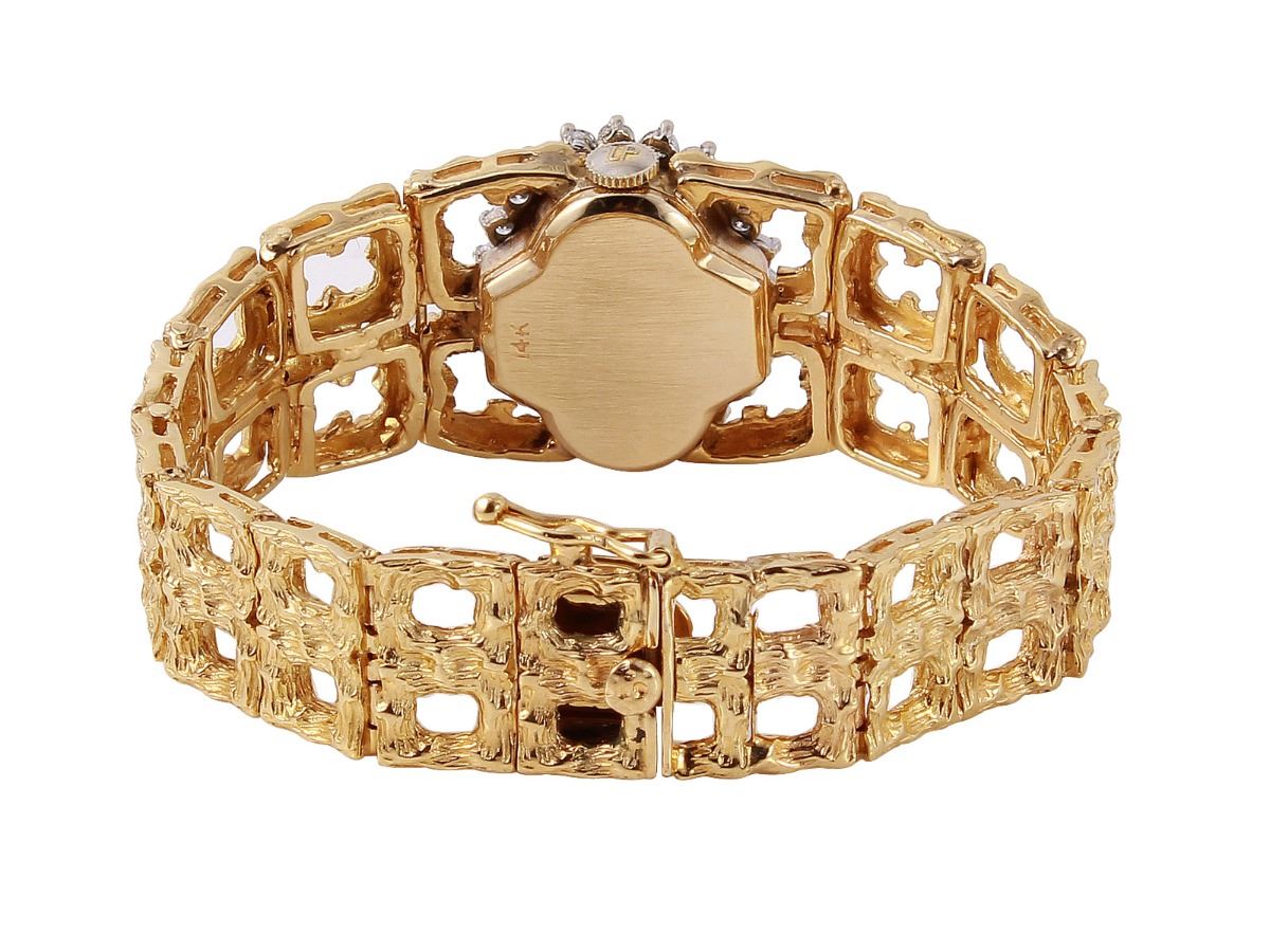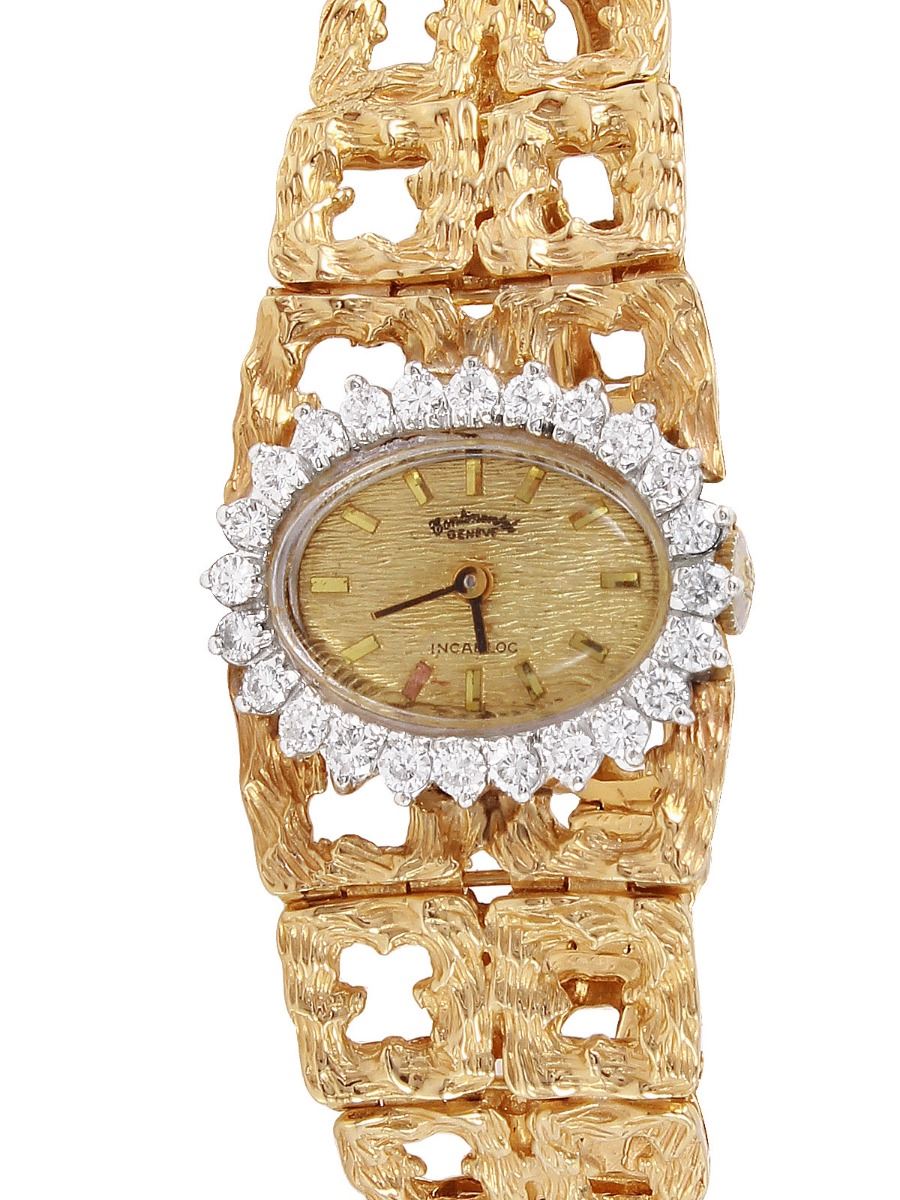 Geneve Incabloc Swiss Made Diamond Wristwatch. Case: Oval, 14K yellow gold with diamond bezel, 22mm x 17mm, 7.30mm thick, acrylic crystal, stamped 14K on the back, crown with LP stamp. Movement: Swiss made manual wind.Dial: Gold with gold markers and baton steel hands. Bracelet: Nugget design 14K yellow gold with jewelry clasp, 6 inches in length. Signed: Geneve Incabloc on dial. Condition: Movement very good and running. Case is very good, dial is very good ( one of the hour markers is missing), and bracelet is very good. Containing: Twenty-Six prong set round brilliant cut diamonds, measuring 2.20 - 2.20 x 1.32mm (depth est.) approximate total weight of 26 Stones = 1.01ct. Clarity of VS-2 to SI-1, Color of G - H, Cut is Very Good. Approximate Total Weight of Diamonds 1.01ct. Total Weight of Diamond Wristwatch 40.00gm. The descriptions listed should not be construed as an appraisal. The detail is provided as a guideline for color, clarity, weights and measurements to the best of our ability. We welcome inspections. WE SHIP WORLDWIDE!