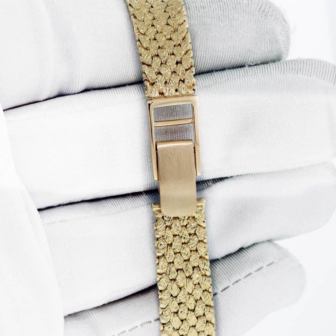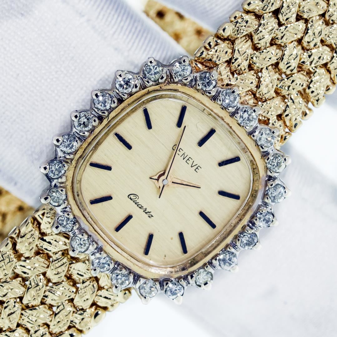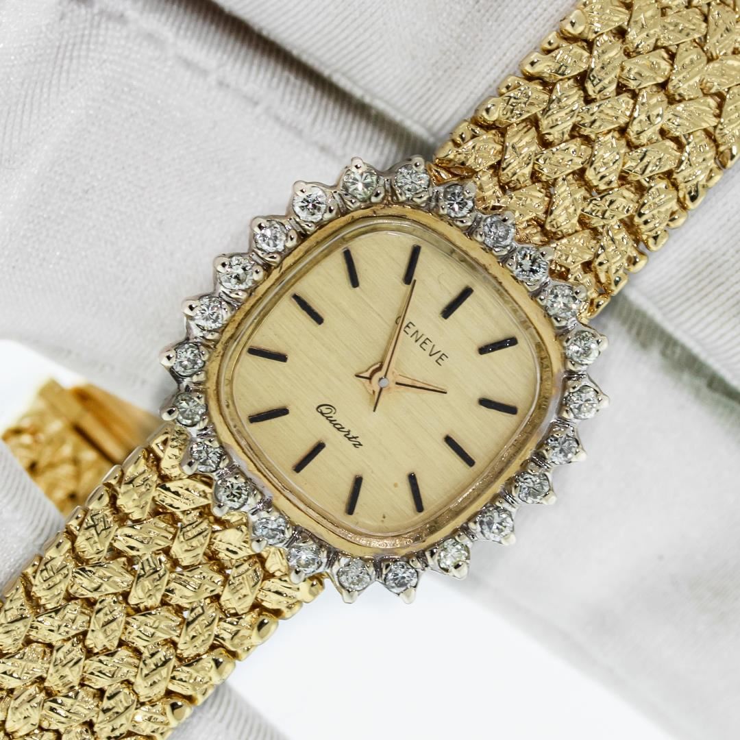 One Ladies Pre Owned Geneve Quartz 14K Yellow Gold Diamond Wristwatch, This Watch Has Brand New Battery & Has Been Electronically Tested, 14K Solid Yellow Gold Case: 18MM, Gold Crown, Bezel: 14K Gold Bezel With Factory Genuine Diamonds, Diamond Bezel Weight: .50 Carats. Crystal: Plastic Crystal, Hands: Yellow Hands, Movement: Quartz Movement, Geneve Dial: Champagne Dial With Index Hour Markers, Model: Geneve Quartz Wristwatch. Condition: G-6 Extra Fine. Bracelet: 14K Yellow Gold Braded Bracelet. Bright Polish. Fits Up To 6.25 Inch Wrist, Gold Jewelry Clasp, This Watch Has Time Tested And Is In Excellent Condition. The Gold Weight Of The Watch Is 34 Grams.