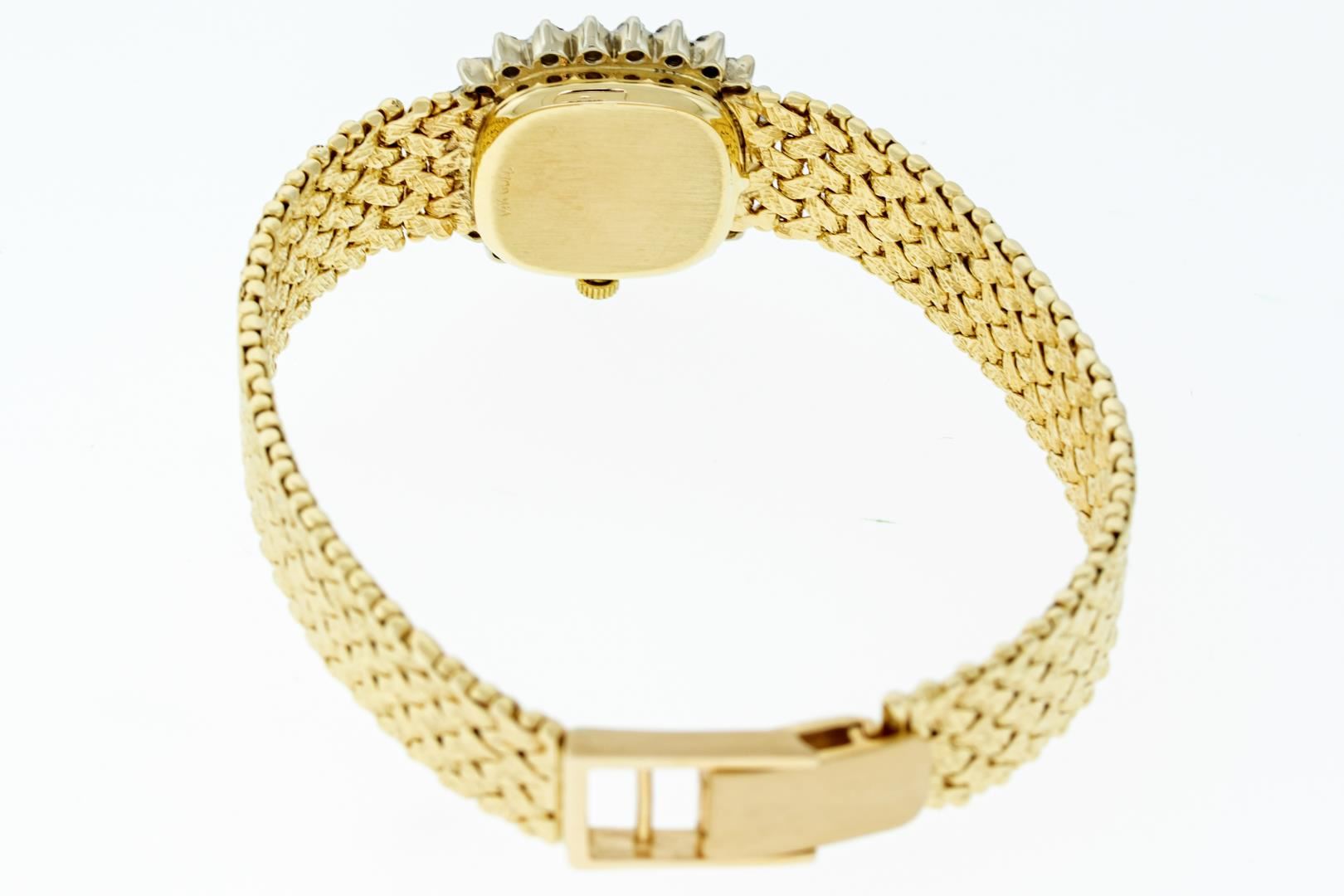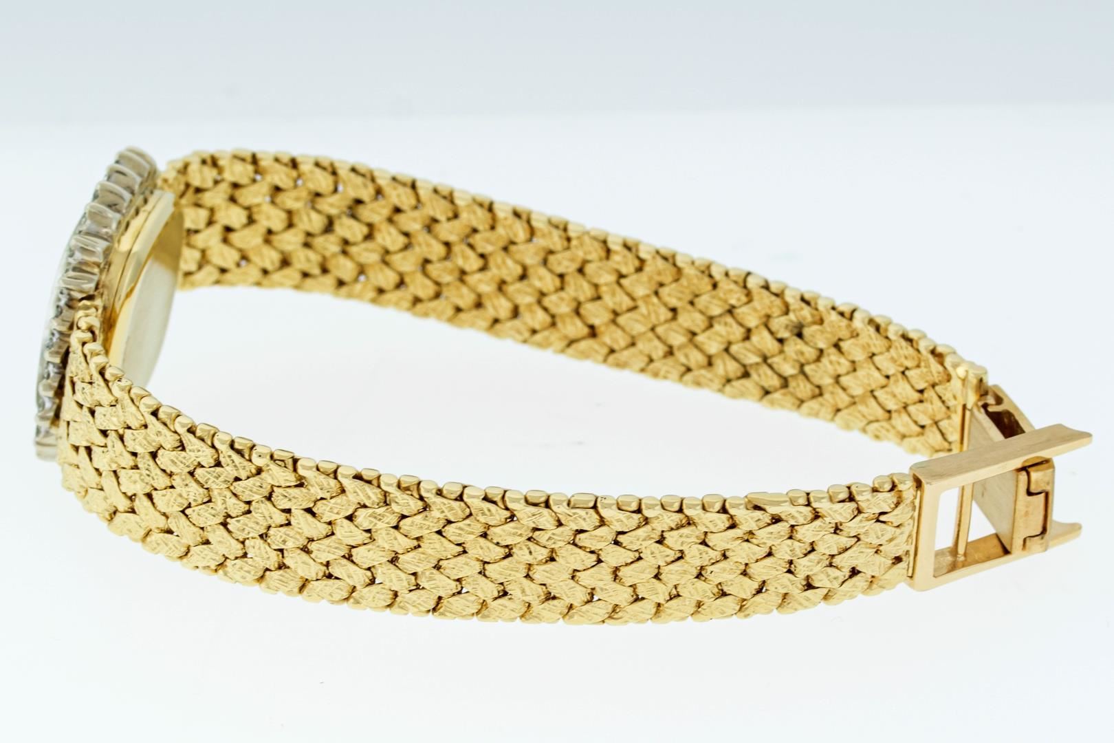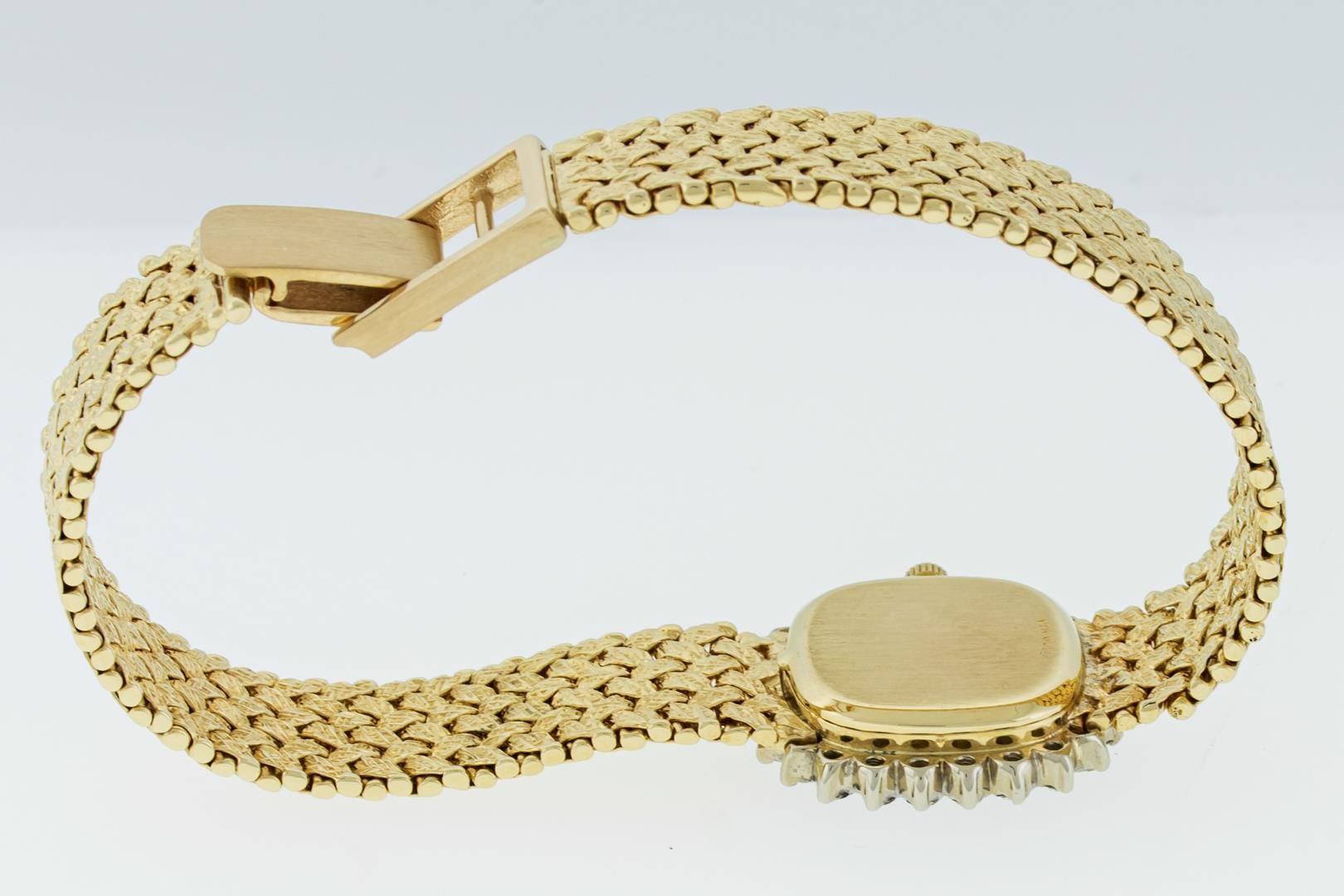 One Ladies Pre Owned Geneve Quartz 14K Yellow Gold Diamond Wristwatch, This Watch Has Brand New Battery & Has Been Electronically Tested, 14K Solid Yellow Gold Case: 18MM, Gold Crown, Bezel: 14K Gold Bezel With Factory Genuine Diamonds, Diamond Bezel Weight: .50 Carats. Crystal: Plastic Crystal, Hands: Yellow Hands, Movement: Quartz Movement, Geneve Dial: Champagne Dial With Index Hour Markers, Model: Geneve Quartz Wristwatch. Condition: G-6 Extra Fine. Bracelet: 14K Yellow Gold Braded Bracelet. Bright Polish. Fits Up To 6.25 Inch Wrist, Gold Jewelry Clasp, This Watch Has Time Tested And Is In Excellent Condition. The Gold Weight Of The Watch Is 34 Grams.