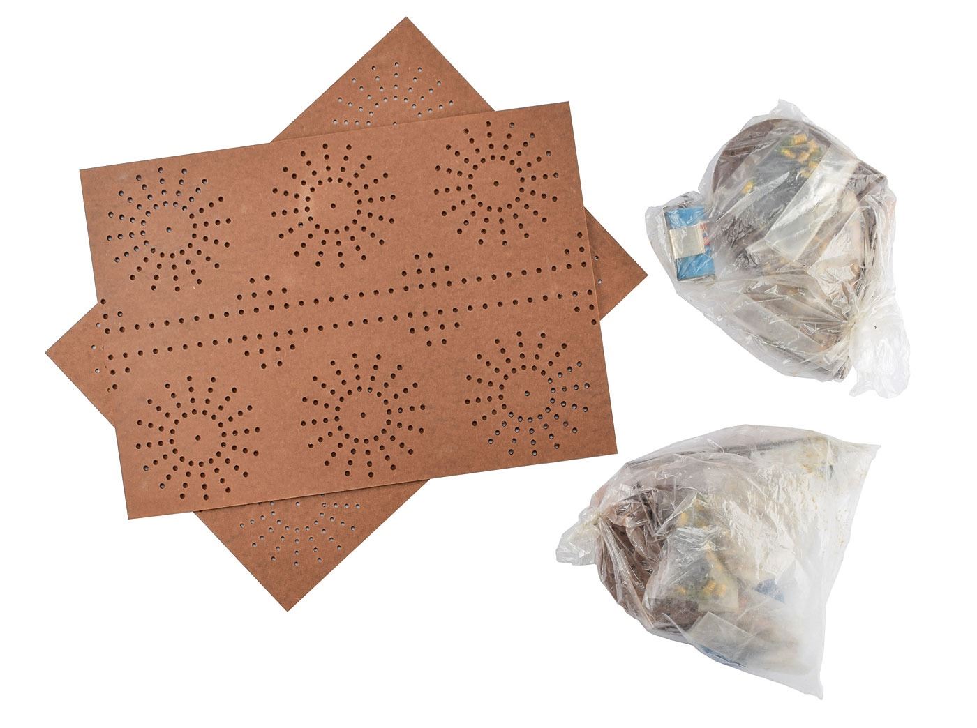 Original Geniac Electric Brain manufactured by the Oliver Garfield Company, Inc., in 1955, which includes two main perforated masonite boards, 12 circular masonite discs, and numerous loose parts such as bolts, nuts, brackets, wiring, and a battery. Also includes the original box and various instruction booklets. In very good to fine condition. The Geniac was an educational toy billed as a 'computer' designed and marketed by Edmund Berkeley; widely advertised in magazines like Galaxy Science Fiction, the Geniac provided many youths with their first hands-on introduction to computer concepts and Boolean logic.