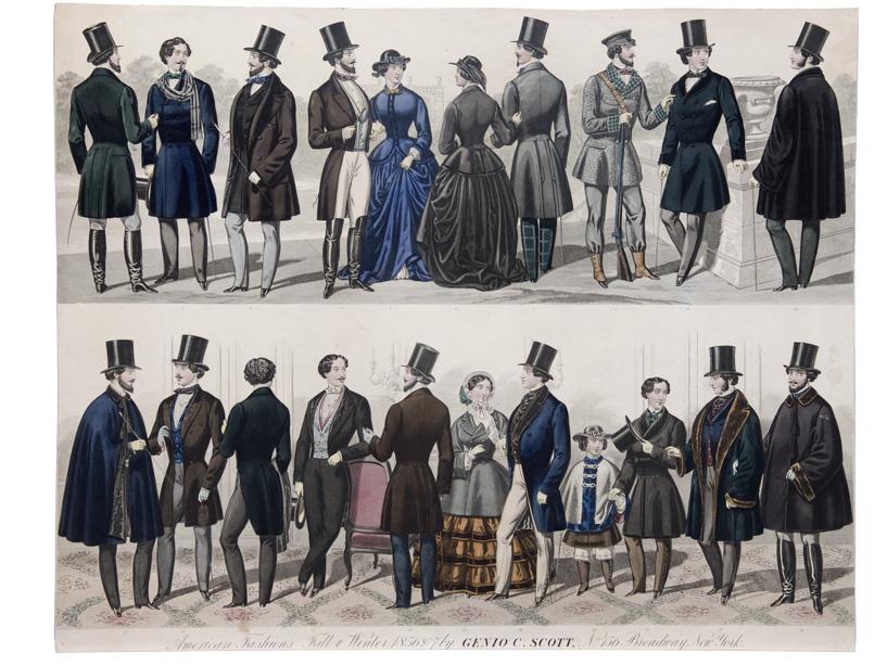 [Genio Scott]. 18 1/2” x 22 3/4” poster advertising American Fashions Fall & Winter 1856-1857 by Genio C. Scott, No 156 Broadway New York.” Wonderfully illustrated with twenty-one color drawings of the seasons’ fashions. Genio Columbus Scott began his career in the fashion periodical business in New York City, publishing Scott’s Report of Fashions and The Monitor of Fashion. He also owned a clothing store on Broadway called Fashions. However, his true love was fly fishing. He wrote Fishing in American Waters (1875), illustrating it with 170 of his own pencil sketches. Fine.