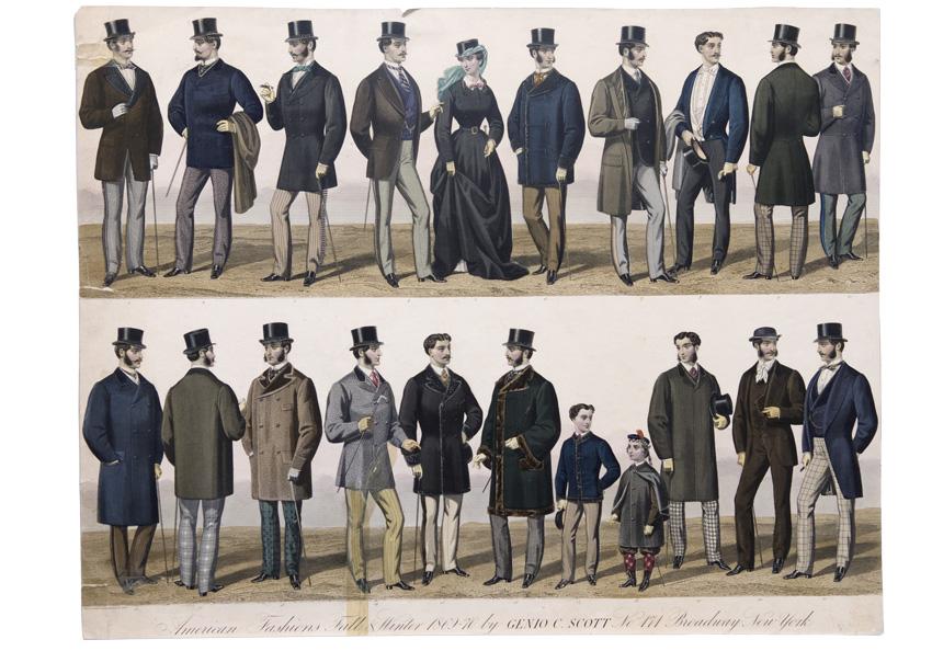 [Genio Scott]. 26 1/8” x 21 1/2” poster advertising American Fashions Fall & Winter 1869-1870 by Genio C. Scott, No 615 Broadway New York.” Wonderfully illustrated with nineteen color drawings of the seasons’ fashions. Tape repair and some soiling. Numerous old glassine repairs at tears. Genio Columbus Scott began his career in the fashion periodical business in New York City, publishing Scott’s Report of Fashions and The Monitor of Fashion. He also owned a clothing store on Broadway called Fashions. However, his true love was fly fishing. He wrote Fishing in American Waters (1875), illustrating it with 170 of his own pencil sketches. Overall, Good.