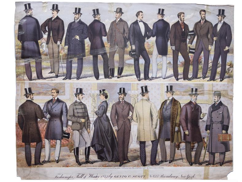 [Genio Scott]. 26 1/8” x 21 1/2” poster advertising American Fashions Fall & Winter 1873 by Genio C. Scott, No 615 Broadway New York.” Wonderfully illustrated with nineteen color drawings of the seasons’ fashions. Genio Columbus Scott began his career in the fashion periodical business in New York City, publishing Scott’s Report of Fashions and The Monitor of Fashion. He also owned a clothing store on Broadway called Fashions. However, his true love was fly fishing. He wrote Fishing in American Waters (1875), illustrating it with 170 of his own pencil sketches. Tape repair and some soiling. Numerous old glassine repairs at tears. Overall, Good.