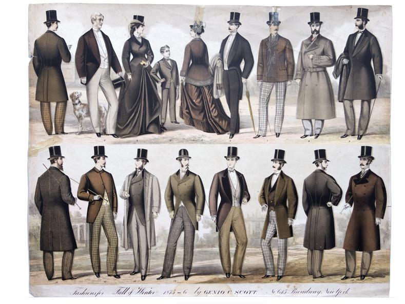 [Genio Scott]. 20 7/8” x 25 7/8” poster advertising American Fashions Fall & Winter 1875-1876 by Genio C. Scott, No 615 Broadway New York.” Wonderfully illustrated with seventeen color drawings of the seasons’ fashions. Genio Columbus Scott began his career in the fashion periodical business in New York City, publishing Scott’s Report of Fashions and The Monitor of Fashion. He also owned a clothing store on Broadway called Fashions. However, his true love was fly fishing. He wrote Fishing in American Waters (1875), illustrating it with 170 of his own pencil sketches. Tape repair to splits. A few tears. Overall Very Good.