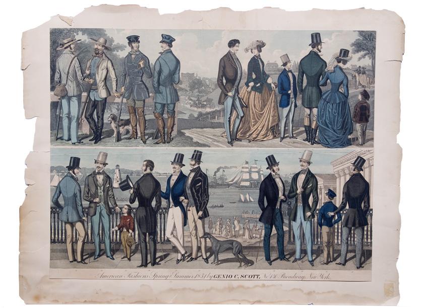 [Genio Scott]. 23 5/8” x 18 3/8” poster advertising American Fashions Spring and Summer 1851 by Genio C. Scott, No 130 Broadway New York.” Wonderfully illustrated with twenty color drawings of the seasons’ fashions. Genio Columbus Scott began his career in the fashion periodical business in New York City, publishing Scott’s Report of Fashions and The Monitor of Fashion. He also owned a clothing store on Broadway called Fashions. However, his true love was fly fishing. He wrote Fishing in American Waters (1875), illustrating it with 170 of his own pencil sketches. Tipped onto a larger sheet. Split at center of poster. Overall Very Fine.