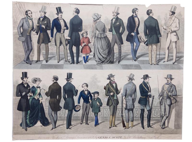 [Genio Scott]. 18 3/8” x 22 3/4” poster advertising American Fashions Spring & Summer 1854 by Genio C. Scott, No 130 Broadway New York.” Wonderfully illustrated with twenty color drawings of the seasons’ fashions. Genio Columbus Scott began his career in the fashion periodical business in New York City, publishing Scott’s Report of Fashions and The Monitor of Fashion. He also owned a clothing store on Broadway called Fashions. However, his true love was fly fishing. He wrote Fishing in American Waters (1875), illustrating it with 170 of his own pencil sketches. Splits at edges. One pin hole. Overall Fine.