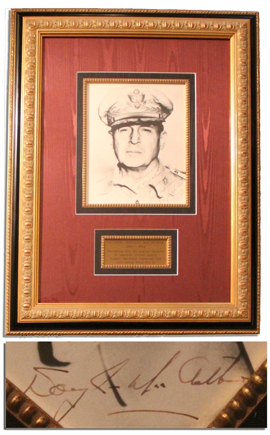 Excellent 8'' x 10'' black and white photo signed by famed WWII General Douglas MacArthur. Signed and inscribed: ''To President Hays and the First National Bank of Cincinnati: With best wishes Douglas MacArthur''. Photo is nicely matted and framed to an overall size of 20.25'' x 26.5''. Near fine condition.