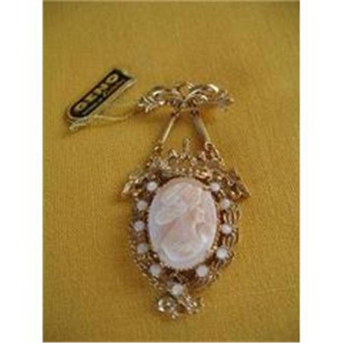 This hand carved Italian Cameo pin surrounded by 11 small rounded opal stones is marked on the back: Geno with a C in a circle. The label attached is marked: Geno Division of Richelieu on one side and Genuine Hand Carved Italian Cameo on the other. Beautifully done the cameo is prong set, she has upswept hair and is set raised in the center of the metal leaf banding surrounding her with 11 small rounded opal stones that hang from a Trefoil shaped pin by 2 goldtone mesh loops. In Unused condition it measures 2 3/4 inches tall and 1 1/2 inches wide. A wonderful additon to any Italian Cameo Brooch Collection. <BR>SH & Ins. will be quoted after orders placed. If you have questions please contact me and thank you for looking.