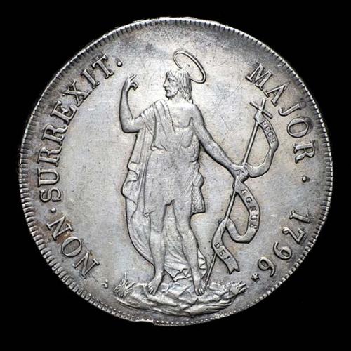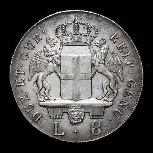 Repubblica di Genova - 8 Lire 1796 - Zecca: Genova - Diritto: due grifoni reggono lo stemma della Repubblica e la corona sovrastante - Rovescio: San Giovanni stante volto a sinistra nell'atto di predicare - gr. 33,24 - Di qualità apprezzabile