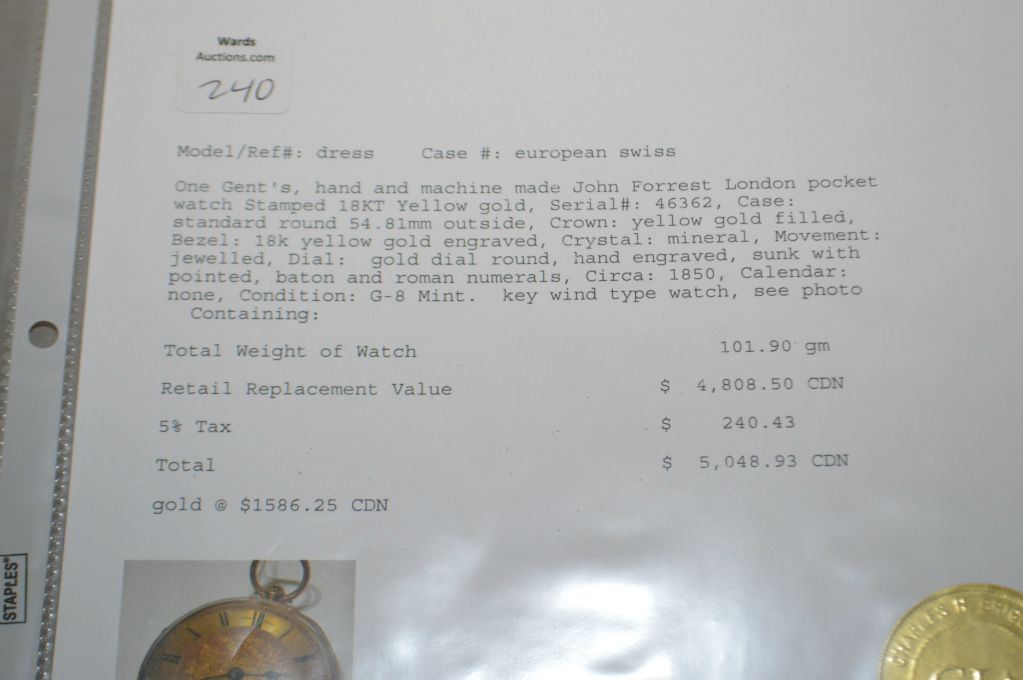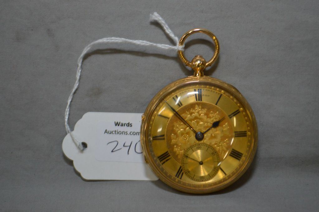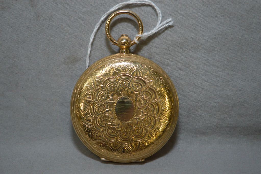 Gent's 18kt yellow gold key wind John Forrest London pocket watch, serial # 46362 with hand engraved gold dial, Roman numerals and second sweep, circa 1850. Working at time of cataloguing. Retail replacement value $4,808.00
