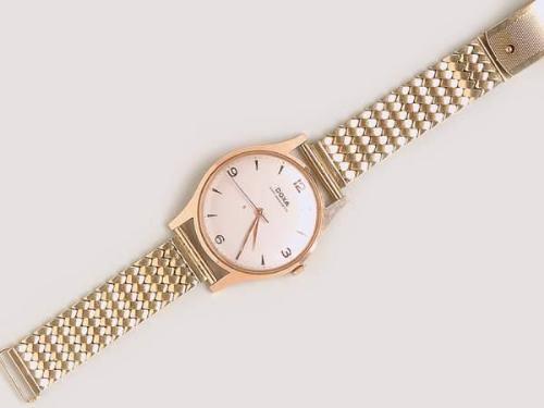 14 K gold bracelet, metal face with Arabic and baton numerals, central seconds, C 11 1/2 movement in working condition, case, face and movement are marked Doxa, Switzerland, circa 1960, import mark, case number: 1230197, length: 18 cm, gross weight 45.5 g