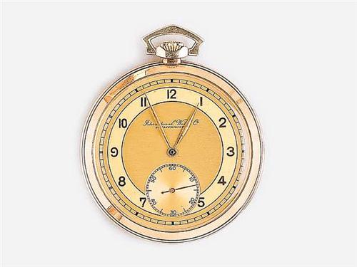 14 K gold, guilloche case, metal inside cover, yellow metal face with Arabic numerals and subsidiary seconds, in working condition, case, face and movement are marked International Watch Co. Schaffhausen, Switzerland, circa 1940, case number: 1044615, mov