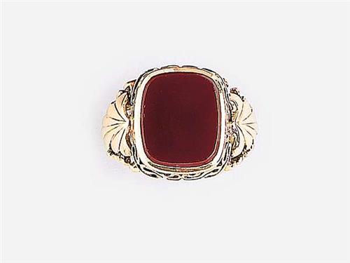 14 K gold, cornelian decoration on the head, flanked by leaves, circa 1940, marked, weight: 11.0 g, diameter: 20.3 mm.