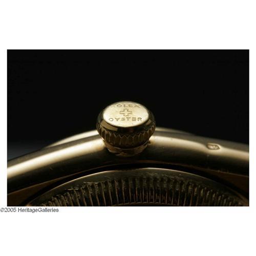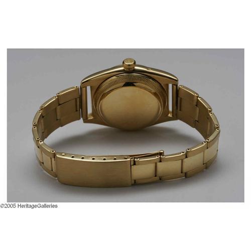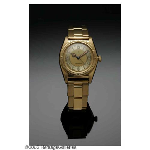 <B>A Gent's Rolex Bubbleback 14K Gold Wrist Watch</B></I><BR><BR>The case, band, back and crown entirely of yellow gold with scarce fancy bezel, circa 1945, with Rolex box and appraisal dated February 13, 1997<BR><BR><I>Please see special condition report notes.</B></I>1 Items <BR><BR><B>Condition Report:</B> Condition is exceptional. Appraisal by others states "The original bracelet is very rare and we have never seen one in this "as new" condition. "the watch also has a slightly fancy bezel which is also quite scarce".