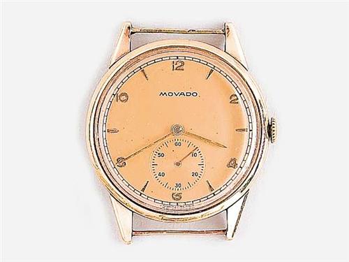14 K gold case, Budapest, circa 1940, marked, yellow metal face with subsidiary seconds, Cal 75 lever watch with 15 jewels in working condition, face and movement are marked Movado, Switzerland, circa 1940, case number: 10013-31, gross weight 26.9 g.