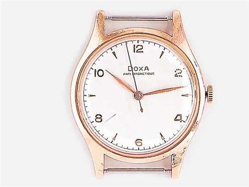 14 K gold, cream colour metal face with central seconds, case, face and movement are marked Doxa, Switzerland, circa 1940, import mark, case number: 1069801 9816 AD, gross weight: 26.9 g.