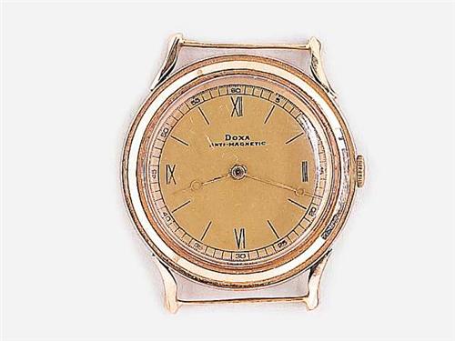 14 K gold, case with fixed ears, yellow metal face with baton and Roman numerals, C 14 11 1/4 movement in working condition, case, face and movement are marked Doxa, Switzerland, circa 1930, gross weight: 24.5 g.