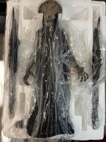 The maquette perfectly captures the Angel of Death’s unsettling beauty and gothic design. The Angel stands tall and gaunt, shrouded in a long, flowing, dark cloak that is sculpted. The exposed chest shows a skeletal ribcage. The skull-like head features a smooth, bone-white surface with a unique cracked or fractured crown detail. The wings are the centerpiece of the figure. The massive wings are sculpted with a feathered texture but appear stiff and ancient. The most iconic detail is the presence of numerous eyes embedded across the wings, which are painted in a striking golden/bronze color. The figure has long, clawed fingers and is posed in a dramatic, almost inviting, yet eerie, manner.