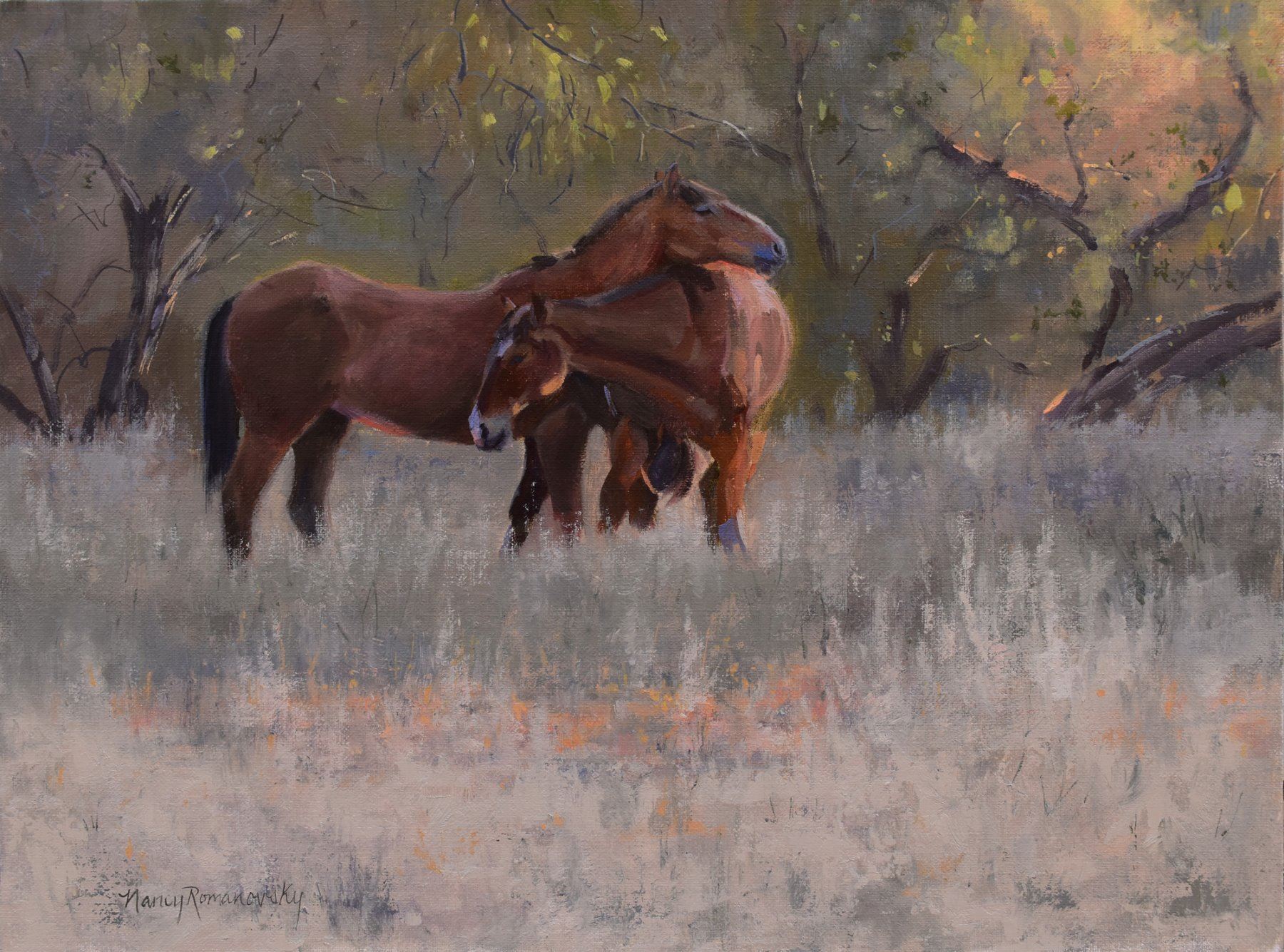 Artist: Nancy Romanovsky. Title: Gentle Morning. Artwork size: 12" x 16". Frame: 17" x 21". Medium: Oil. Artist's description: The wild horses of the Salt River in Arizona are somewhat elusive. On a hike out searching for them one early morning, I came across this couple. Their gentle embrace-like pose with the soft morning sun through the trees was so peaceful and free. I painted them to remember how vital the freedom of our wild herds are.