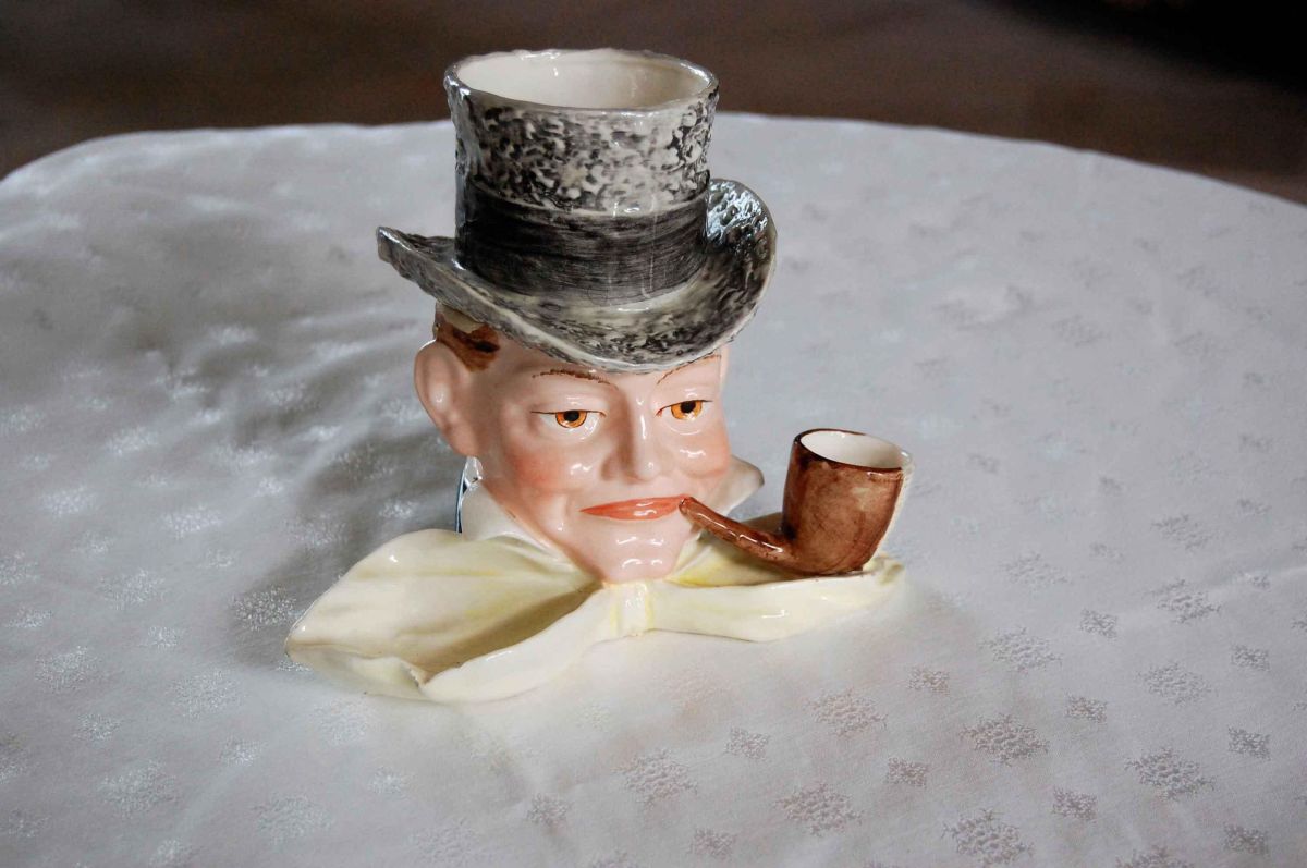 Gentleman in Top Hat Tobacco Humidor. Pipe bowl is open as match holder, top hat is open as waste bow. Excellent condition. 7 X 6 1/2 inches tall.