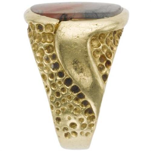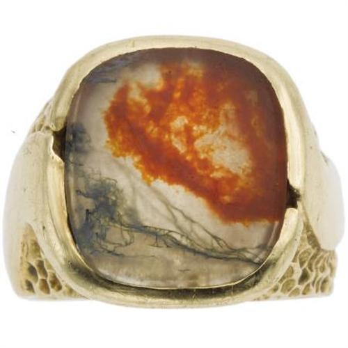 <B>Gentleman's Agate, Gold Ring</B></I><BR><BR>The ring features a moss agate tablet, bezel set in textured 14k yellow gold. Gross weight 15.30 grams. <BR>*Note: Size 6-1/2 (sizeable) <B>Condition Report:</B> Good condition.<BR><BR><BR><b>Shipping:</b> Miscellaneous Collectibles, Smal (<a target="_blank" href="http://www.heritageauctions.com/common/shipping.php">view shipping information</a>)