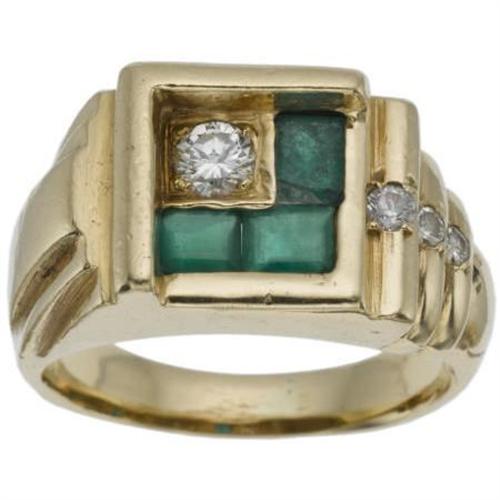 <B>Gentleman's Diamond, Emerald, Gold Ring</B></I><BR><BR>The ring, of geometric design, features a round brilliant-cut diamond weighing approximately 0.23 carat, enhanced by square-cut emeralds weighing a total of approximately 0.75 carat, further enhanced by full-cut diamonds, set in 14k yellow gold. Total diamond weight is approximately 0.35 carat. Gross weight 14.10 grams. <BR>*Note: Size 9-3/4 (sizeable) <B>Condition Report:</B> Good condition.<BR>One of the emeralds is chipped.<BR><BR><b>Shipping:</b> Miscellaneous Collectibles, Smal (<a target="_blank" href="http://www.heritageauctions.com/common/shipping.php">view shipping information</a>)