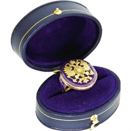<B>Gentleman's Enamel and Gold Ring</B></I><BR><I>20th century</B></I><BR><BR>In the Russian style, applied with a gold Russian imperial eagle on a blue enamel base within enameled border- size 7 (sizeable)<BR><BR>Provenance:<BR>Purchased from a private dealer, Litchfield, CT<BR>