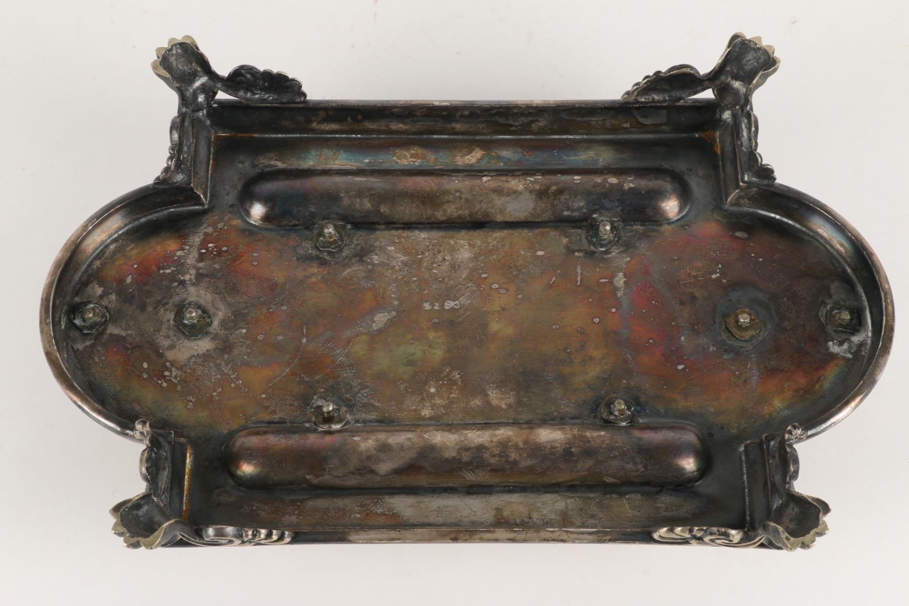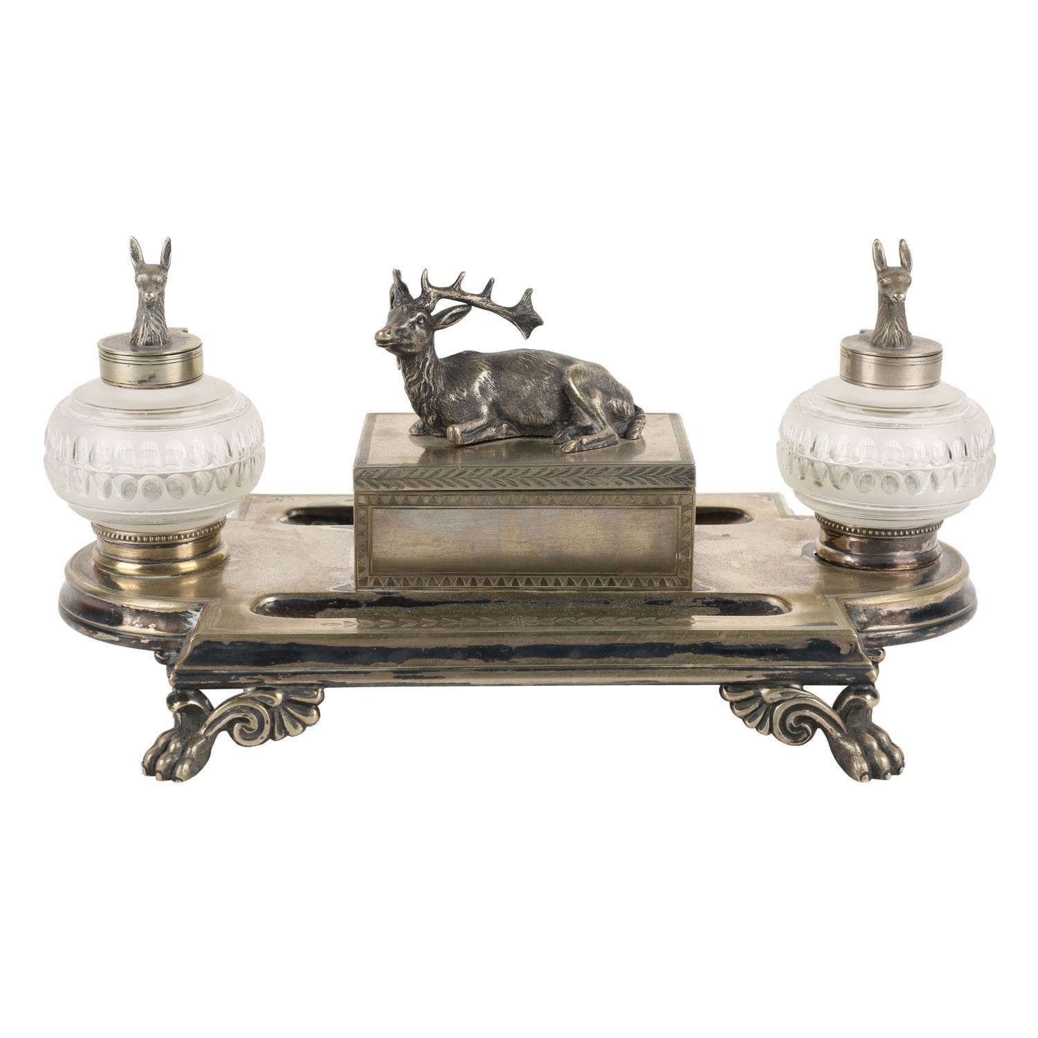 Lot 292 - Circa 1900. Footed silverplated desk set in stag theme. Features two penrests, two cut and frosted glass inkwells, and a cigarette case. Base stamped "3194". 12" x 8" x 5". Tarnished. $300-500.