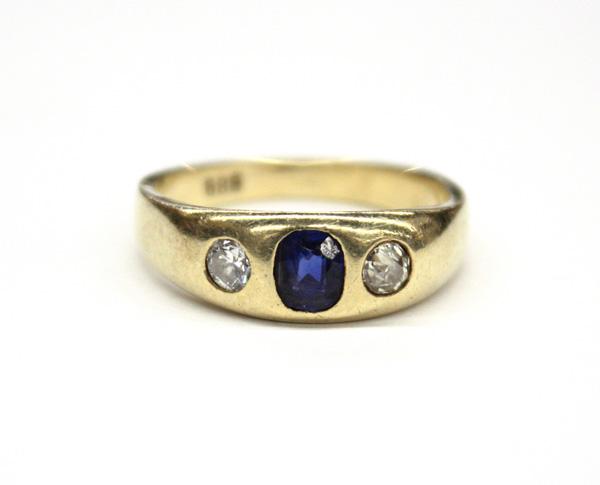Gentleman's sapphire and diamond three stone ring; mounted in 14k yellow gold, set with (1) cushion cut blue sapphire measuring 5.5 x 4.4 x 2.8 mm, accented on either side by (1) 0.16 ct round full cut diamond and (1) 0.22 ct old European full cut diamond. Total ring weight 6.1 grams. Ring size 10