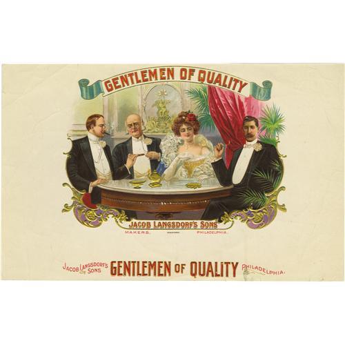 <B><I>Gentlemen of Quality</B></I></B></I><B> Cigar Label by Jacob Langsdorf's Sons, Philadelphia.</B></I> Full color lithographed 9.5" x 6.25" inner label with gold-embossed elements. A comely Edwardian belle is seated amid potted palms with three cigar-puffing gents in tuxedos. This is the sort of snooty stuff that gave the era proletarian revolution and muckraking journalism. Slight creasing and soiling, else very fine condition.<BR><BR><b>Shipping:</b> Small Flat (<a target="_blank" href="http://www.heritageauctions.com/common/shipping.php">view shipping information</a>)