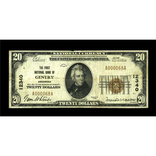 <B>Gentry, AR</B></I> - $20 1929 Ty. 1 <B>The First NB</B></I> Ch. # 12340<BR> This serial number 68 issue is a new discovery bringing the number of total notes known from this one bank town to eight. Though eight pieces are known, this is only the fourth piece to appear in auction and the first one since June of 1999. The paper is whole and original with pleasing signatures of Tom Whiteside and Marion Wasson. Nice <B>Fine.</B></I><BR><BR><b>Shipping:</b> Coins & Currency (<a target="_blank" href="http://www.heritageauctions.com/common/shipping.php">view shipping information</a>)