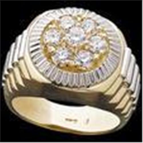 This Two Tone Gents ring is VERY impressive! It is 14k Yellow Gold and White Gold and it features 7 SPARKLING Diamonds = 1.50 CARATS!! The Diamonds are all well matched, I1 Clarity and H Color. It is a size 10 and I can resize it for you.