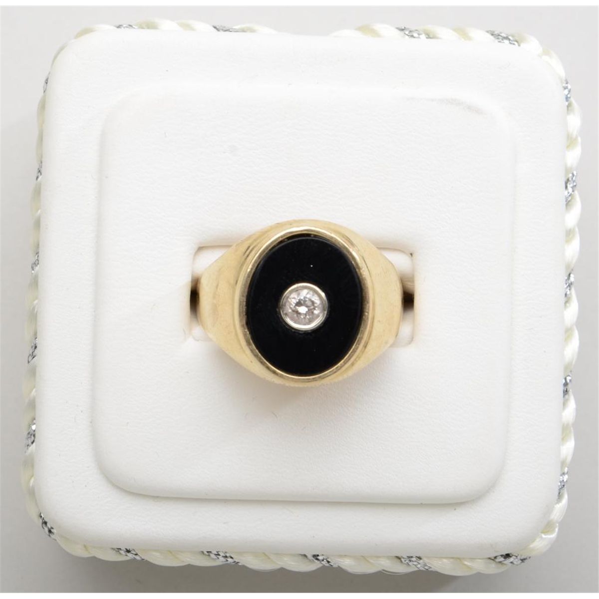 Gents 14k yellow gold (9gms) ring set with a black onyx embedded with a round diamond. Est. $850-$1,700.