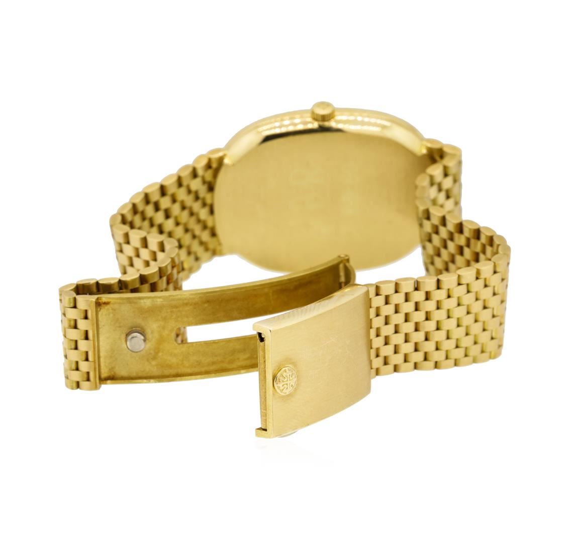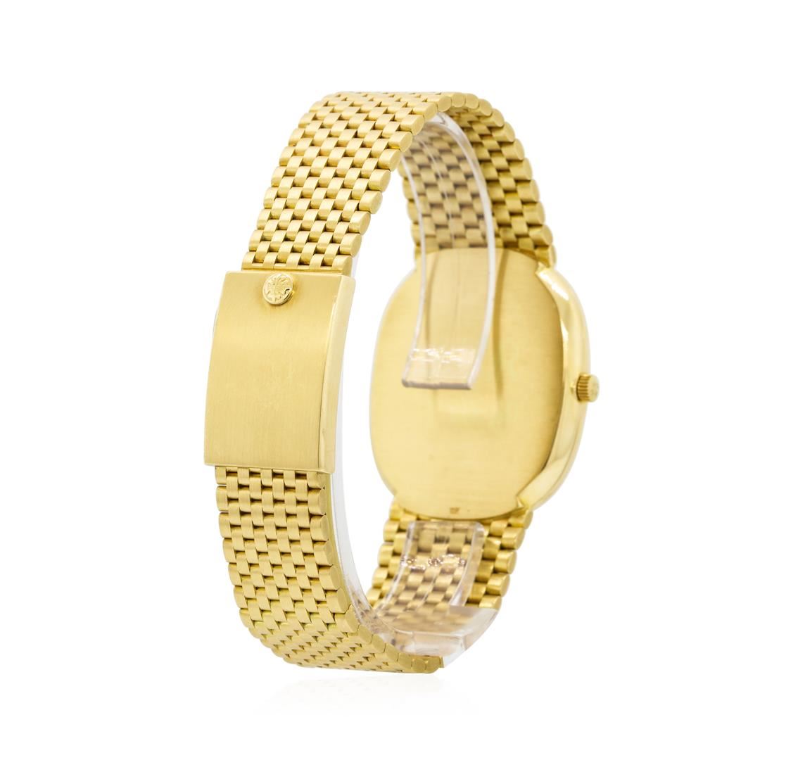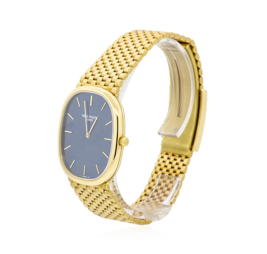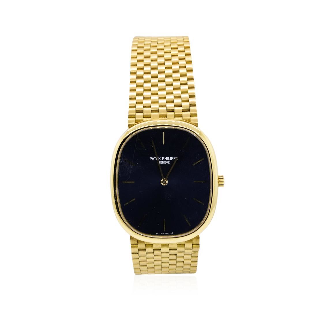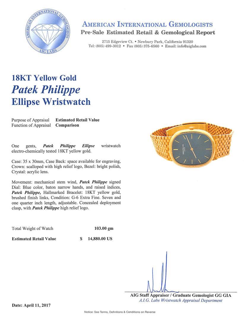 One gents, Patek Philippe Ellipse wristwatch electro-chemically tested 18KT yellow gold.Case: 35 x 30mm, Case Back: space available for engraving, Crown: scalloped with high relief logo, Bezel: bright polish, Crystal: acrylic lens.Movement: mechanical stem wind, Patek Philippe signed Dial: Blue color, baton narrow hands, and raised indices, Patek Philippe, Hallmarked Bracelet: 18KT yellow gold, brushed finish links, Condition: G-6 Extra Fine. Seven and one quarter inch length, adjustable. Concealed deployment clasp, with Patek Philippe high relief logo. Total Weight of Watch 103.00gm. AIG Appraised at $14,880.00.