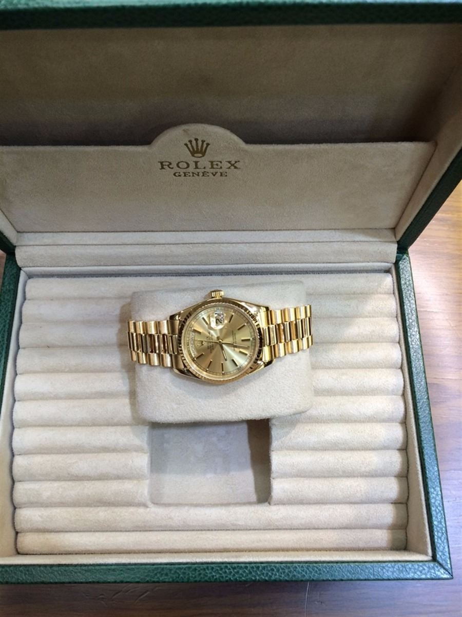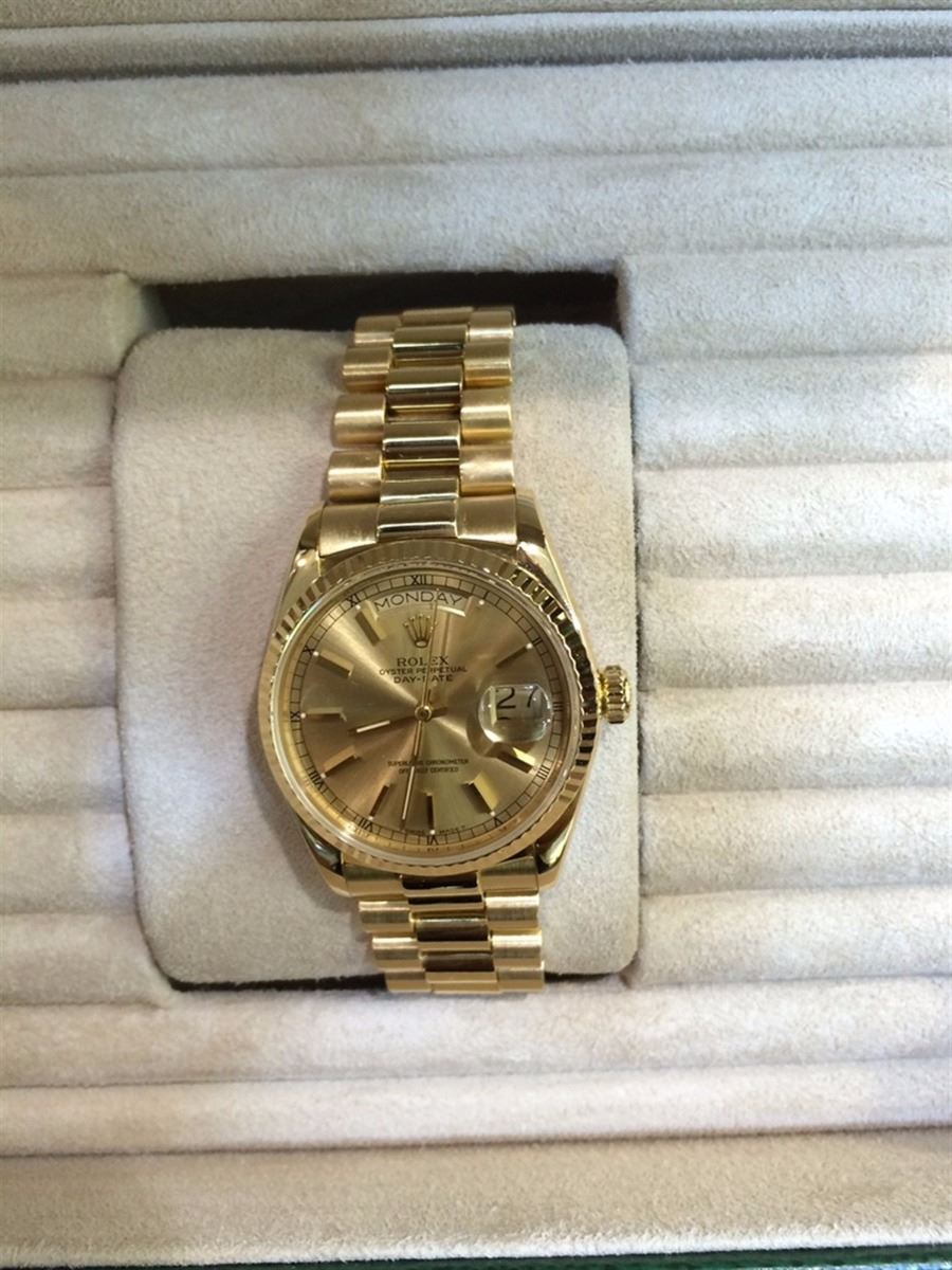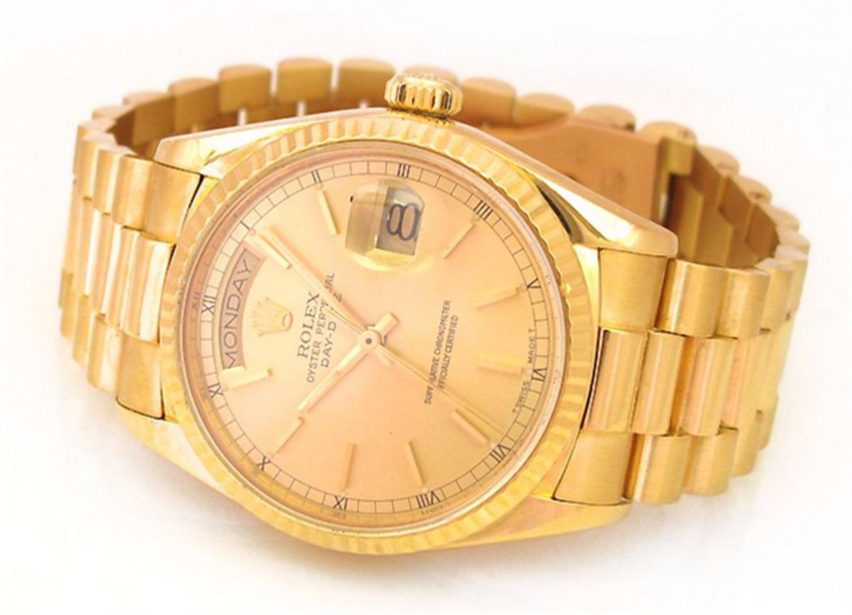 Gents Rolex 18K Yellow Gold Oyster Perpetual Daydate. Champagne Dial. 18K Fluted Bezel. 18K Yellow G