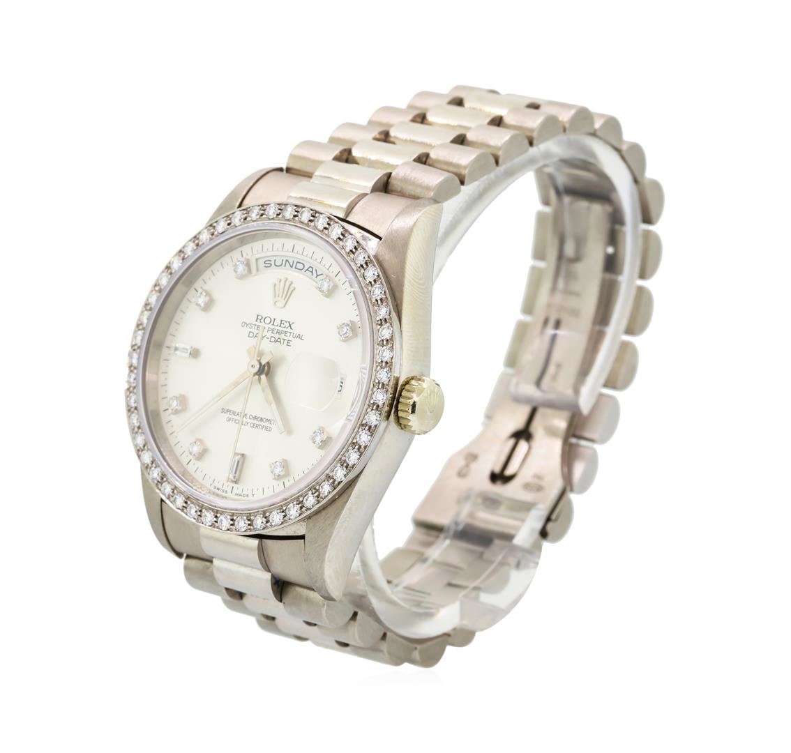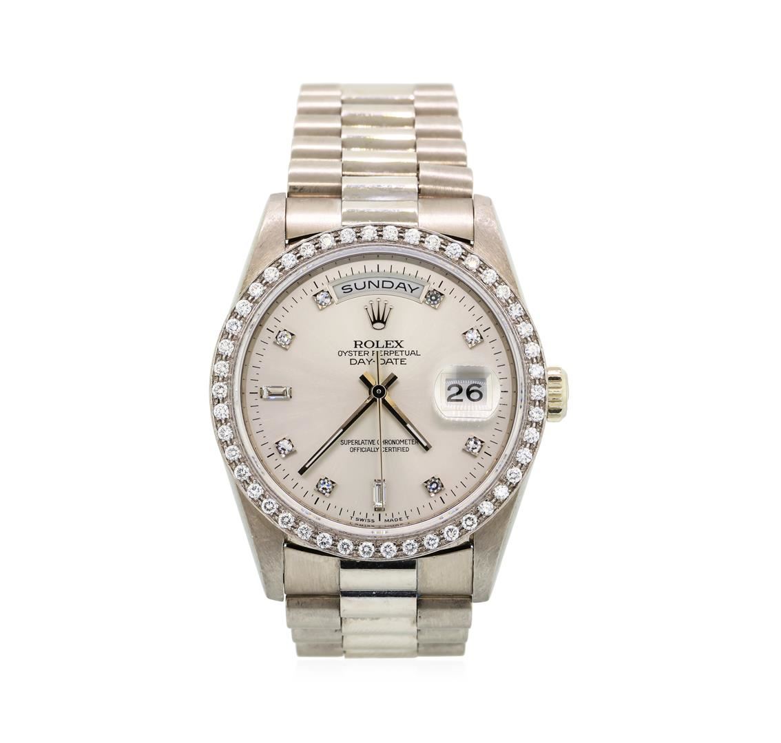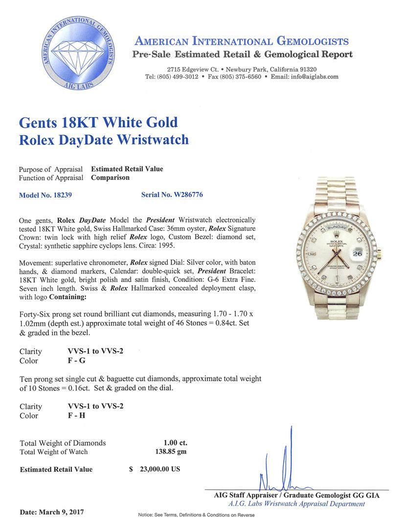 One gents, Rolex DayDate Model the President Wristwatch electronically tested 18KT White gold, Swiss Hallmarked Case: 36mm oyster, Rolex Signature Crown: twin lock with high relief Rolex logo, Custom Bezel: diamond set, Crystal: synthetic sapphire cyclops lens. Circa: 1995.Movement: superlative chronometer, Rolex signed Dial: Silver color, with baton hands, & diamond markers, Calendar: double-quick set, President Bracelet: 18KT White gold, bright polish and satin finish, Condition: G-6 Extra Fine. Seven inch length. Swiss & Rolex Hallmarked concealed deployment clasp, with logo Containing: Forty-Six prong set round brilliant cut diamonds, measuring 1.70 - 1.70 x 1.02mm (depth est.) approximate total weight of 46 Stones = 0.84ct. Set & graded in the bezel. Clarity: VVS-1 to VVS-2 Color F - G Ten prong set single cut & baguette cut diamonds, approximate total weight of 10 Stones = 0.16ct. Set & graded on the dial. Clarity: VVS-1 to VVS-2 Color F - H. Total Weight of Diamonds 1.00ct. Total Weight of Watch 138.85gm. AIG Appraised at $23,000.00.