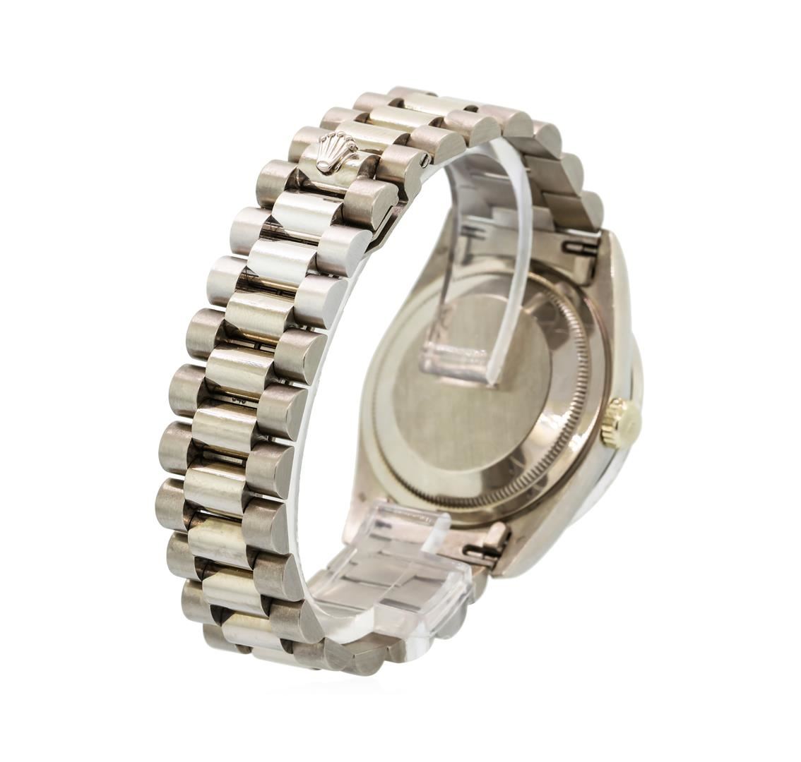 One gents, Rolex DayDate Model the President Wristwatch electronically tested 18KT White gold, Swiss Hallmarked Case: 36mm oyster, Rolex Signature Crown: twin lock with high relief Rolex logo, Custom Bezel: diamond set, Crystal: synthetic sapphire cyclops lens. Circa: 1995.Movement: superlative chronometer, Rolex signed Dial: Silver color, with baton hands, & diamond markers, Calendar: double-quick set, President Bracelet: 18KT White gold, bright polish and satin finish, Condition: G-6 Extra Fine. Seven inch length. Swiss & Rolex Hallmarked concealed deployment clasp, with logo Containing: Forty-Six prong set round brilliant cut diamonds, measuring 1.70 - 1.70 x 1.02mm (depth est.) approximate total weight of 46 Stones = 0.84ct. Set & graded in the bezel. Clarity: VVS-1 to VVS-2 Color F - G Ten prong set single cut & baguette cut diamonds, approximate total weight of 10 Stones = 0.16ct. Set & graded on the dial. Clarity: VVS-1 to VVS-2 Color F - H. Total Weight of Diamonds 1.00ct. Total Weight of Watch 138.85gm. AIG Appraised at $23,000.00.