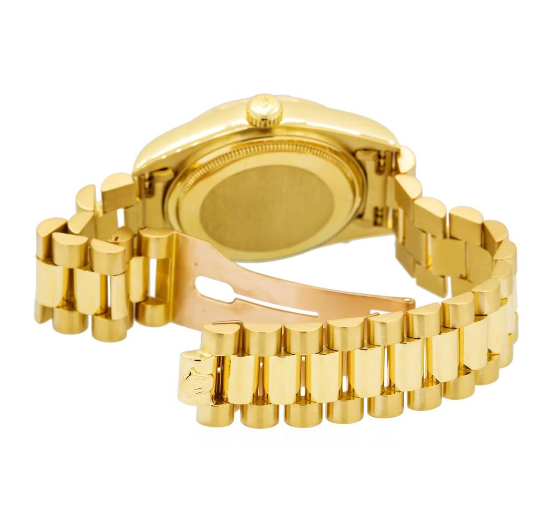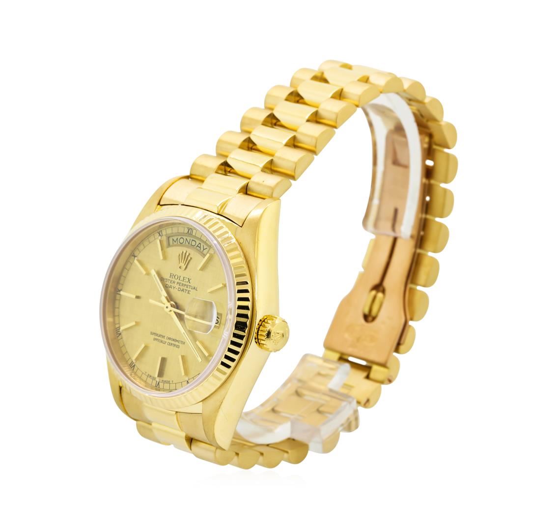 One gents, hand crafted & machine milled Rolex DayDate wristwatch the President electronically tested 18KT yellow gold, Swiss Hallmarked Case: 36mm oyster, Rolex Signature Crown: twinlock with high relief logo, Rolex Hallmarked Crystal: synthetic sapphire cyclops lens, Bezel: fluted, Circa: 1979.Movement: superlative chronometer, Rolex signed Dial: Champagne color, Hound's-tooth pattern with baton hands, raised indices and a bordering minute track, Calendar: single quick set, Rolex President Bracelet: 18KT yellow gold, Condition: G-6 Extra Fine. Bright polish & satin finish. Seven and one half inch length. Concealed Rolex Hallmarked clasp, with logo. Total Weight of Watch 133.05gm. AIG Appraised at $21,000.00.