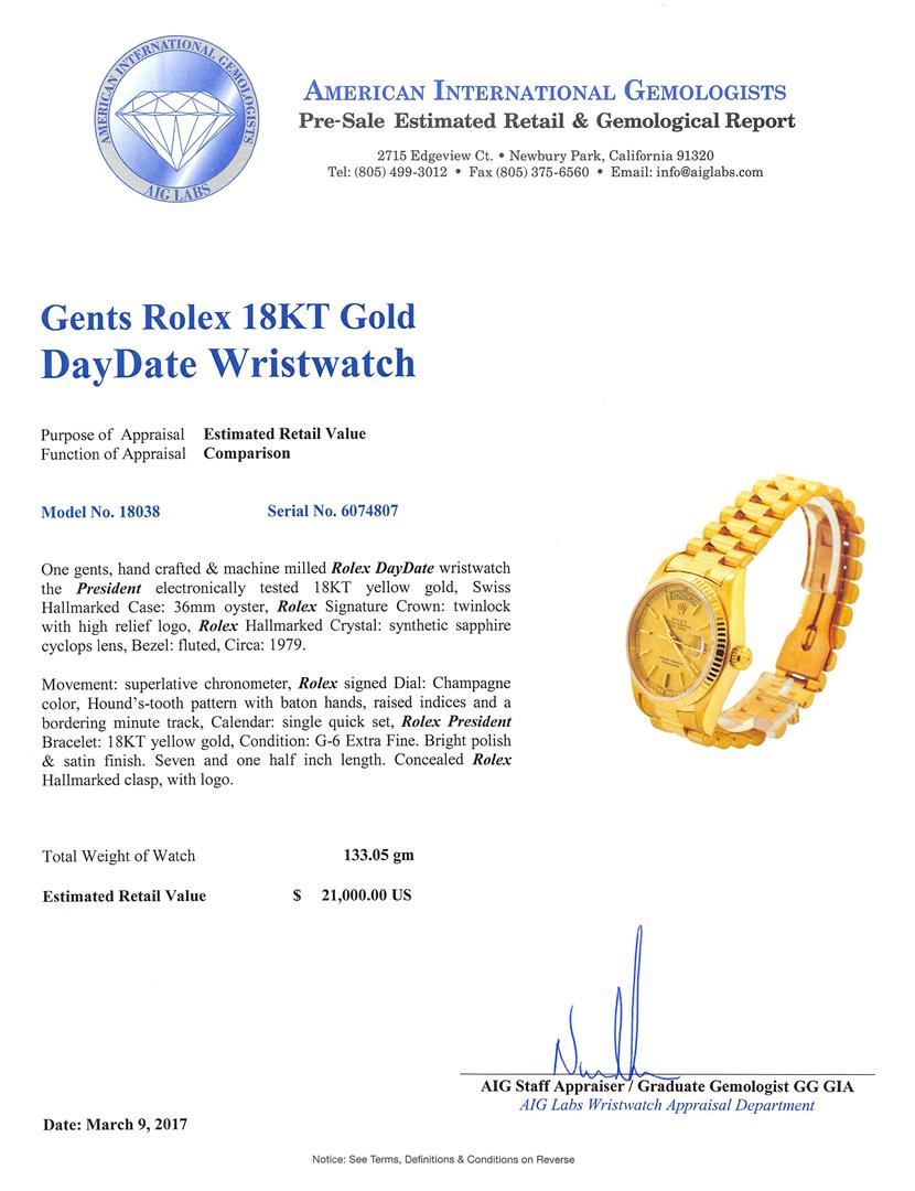 One gents, hand crafted & machine milled Rolex DayDate wristwatch the President electronically tested 18KT yellow gold, Swiss Hallmarked Case: 36mm oyster, Rolex Signature Crown: twinlock with high relief logo, Rolex Hallmarked Crystal: synthetic sapphire cyclops lens, Bezel: fluted, Circa: 1979.Movement: superlative chronometer, Rolex signed Dial: Champagne color, Hound's-tooth pattern with baton hands, raised indices and a bordering minute track, Calendar: single quick set, Rolex President Bracelet: 18KT yellow gold, Condition: G-6 Extra Fine. Bright polish & satin finish. Seven and one half inch length. Concealed Rolex Hallmarked clasp, with logo. Total Weight of Watch 133.05gm. AIG Appraised at $21,000.00.