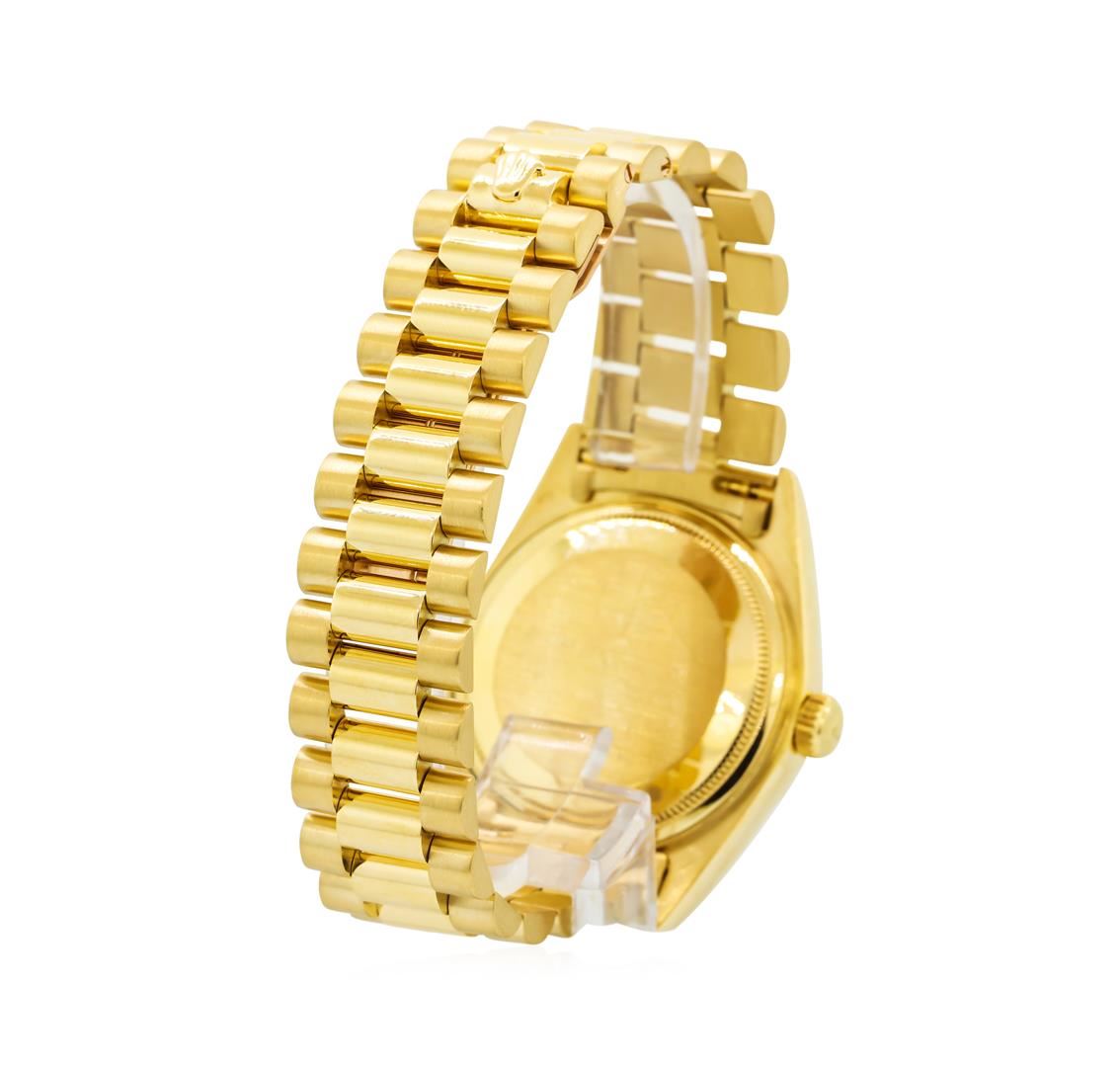 One gents, hand crafted & machine milled Rolex DayDate wristwatch the President electronically tested 18KT yellow gold, Swiss Hallmarked Case: 36mm oyster, Rolex Signature Crown: twinlock with high relief logo, Rolex Hallmarked Crystal: synthetic sapphire cyclops lens, Bezel: fluted, Circa: 1979.Movement: superlative chronometer, Rolex signed Dial: Champagne color, Hound's-tooth pattern with baton hands, raised indices and a bordering minute track, Calendar: single quick set, Rolex President Bracelet: 18KT yellow gold, Condition: G-6 Extra Fine. Bright polish & satin finish. Seven and one half inch length. Concealed Rolex Hallmarked clasp, with logo. Total Weight of Watch 133.05gm. AIG Appraised at $21,000.00.