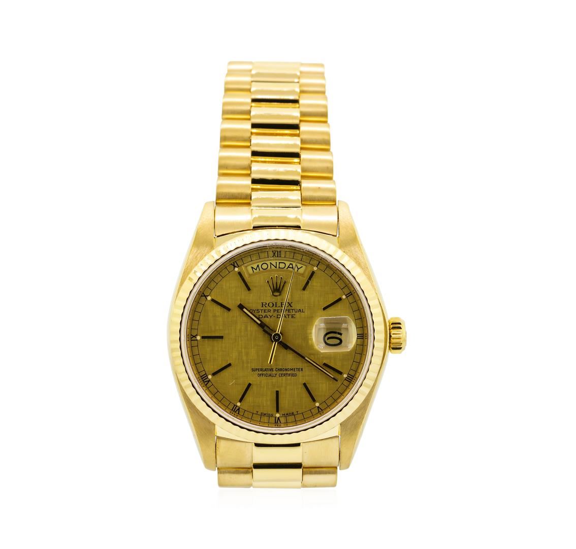 One gents, hand crafted & machine milled Rolex DayDate wristwatch the President electronically tested 18KT yellow gold, Swiss Hallmarked Case: 36mm oyster, Rolex Signature Crown: twinlock with high relief logo, Rolex Hallmarked Crystal: synthetic sapphire cyclops lens, Bezel: fluted, Circa: 1979.Movement: superlative chronometer, Rolex signed Dial: Champagne color, Hound's-tooth pattern with baton hands, raised indices and a bordering minute track, Calendar: single quick set, Rolex President Bracelet: 18KT yellow gold, Condition: G-6 Extra Fine. Bright polish & satin finish. Seven and one half inch length. Concealed Rolex Hallmarked clasp, with logo. Total Weight of Watch 133.05gm. AIG Appraised at $21,000.00.