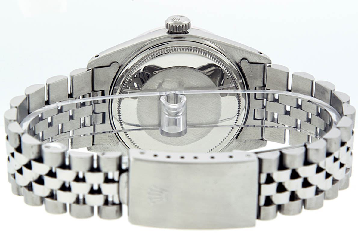One Mens Rolex Datejust Polished Bright with Satin Finish, Serviced & Electronically Tested, Stainless Steel Case:36mm, Stainless Steel Crown, Custom Bezel: 18K White Gold Sapphire Beadset Diamond Bezel, Diamond + Gem Count: 36 Diamonds + 4 Sapphires Total Weight 1.00 Carat, Clarity: Si-VS, Color: G to H. Custom Crystal: Synthetic Sapphire Cyclops Lens. Movement: Automatic Winding Movement Caliber 3035. Custom Dial: Blue Vignette With Diamond Hour Markers, 10 Diamond in Dial G To H In Color, Si-VS Clarity. Date Window: 3 O'Clock Position Date Display, Quickset, Model: 16014 Condition: G-6 Extra Fine. Bracelet:Stainless Steel Jubilee. Bright Polish & Satin Finish. 7.0 Inch Length, Adjustable. Standard Clasp, With Rolex Logo.