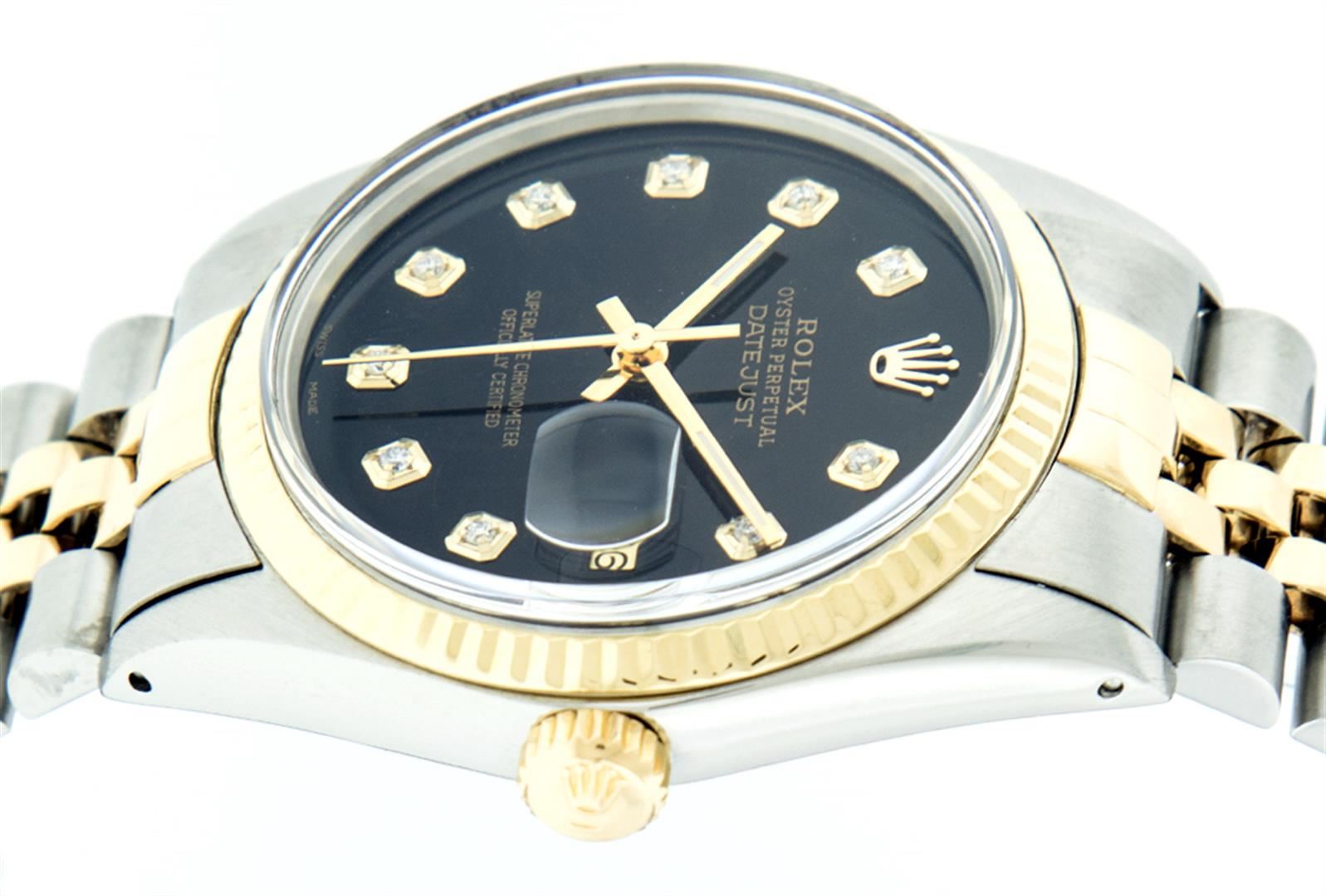 One Gents Two Tone Rolex Datejust Polished, Serviced & Electronically Tested, 14K Yellow Gold & Stainless Steel Case:36mm, 14K Yellow Gold Crown, Bezel: 14K Yellow Gold Fluted Bezel. Custom Crystal: Acrylic Cyclops Lens. Movement: Automatic Winding Movement Caliber 3035. Custom Dial: Black Diamond Dial, Diamond Count: 10 Diamonds In Dial, Color: G to H, Clarity: SI-VS. Date Window: 3 O'clock Position Date Display, Quickset, Model: 16013 Condition: G-6 Extra Fine. Bracelet: Two Tone 14K Yellow Gold & Stainless Steel Jubilee. Bright Polish. 6.5 Inch Length, Adjustable. Standard Clasp, With Rolex Logo.