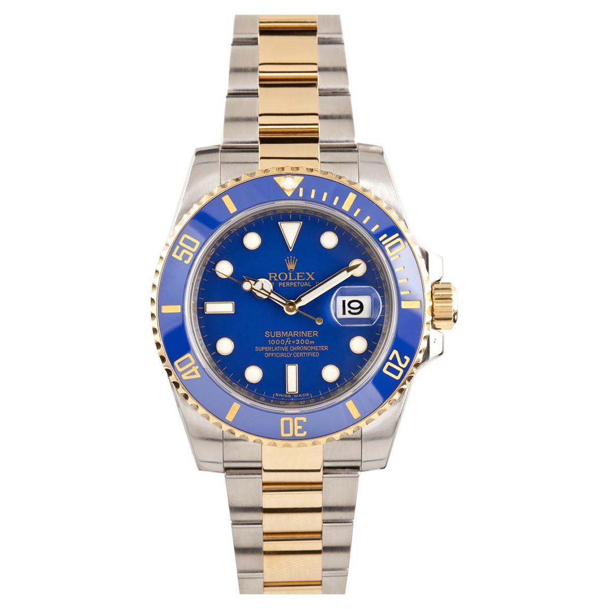 One gents stainless steel and 18KT yellow gold Rolex Submariner wristwatch. Model Name/Number: Submariner 116613. The watch features automatic movement with date, waterproof screw-down crown, scratch resistant sapphire crystal,  rotatable diver's ceramic bezel. Case: 18k gold & stainless steel  (40mm). Dial: Blue with luminous hour markers. Bracelet: 18k yellow gold and stainless with Glidelock clasp.