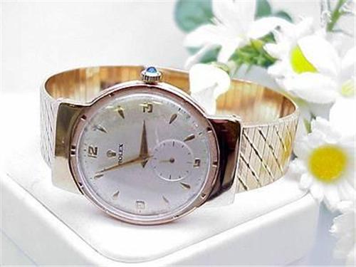 Gents Rolex windup watch with stamped 18kt yellow gold band. Watch is c1950, runs