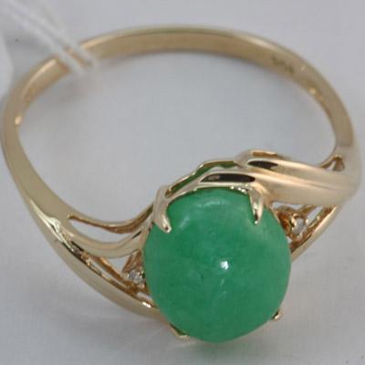 Gemstone: Green Jade 10X8MM ; Diamond Count 1: 2RD ; Diamond Weight: 0.009 ; Gemstone Color: Green ; Gemstone Count: 1 Jade Oval ; Dimension: 10X8MM ; Metal Purity: 14KT ; Metal: Gold-Yellow ; Ring Size: 7